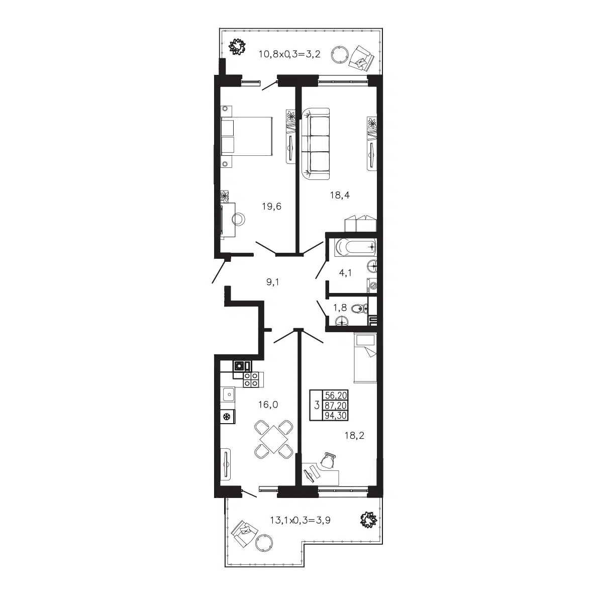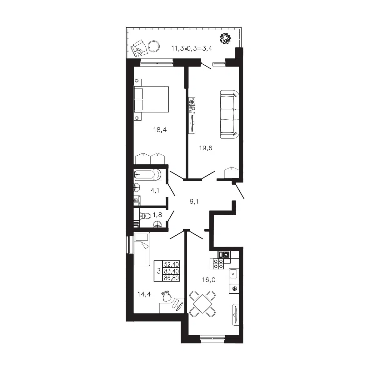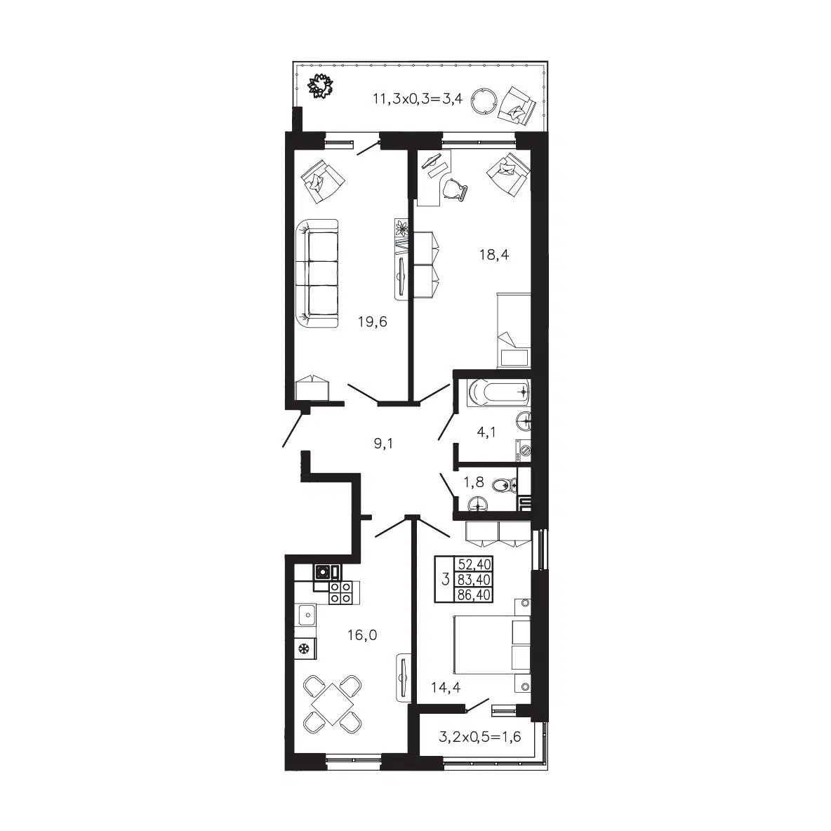 86.4 - 94.3 м²