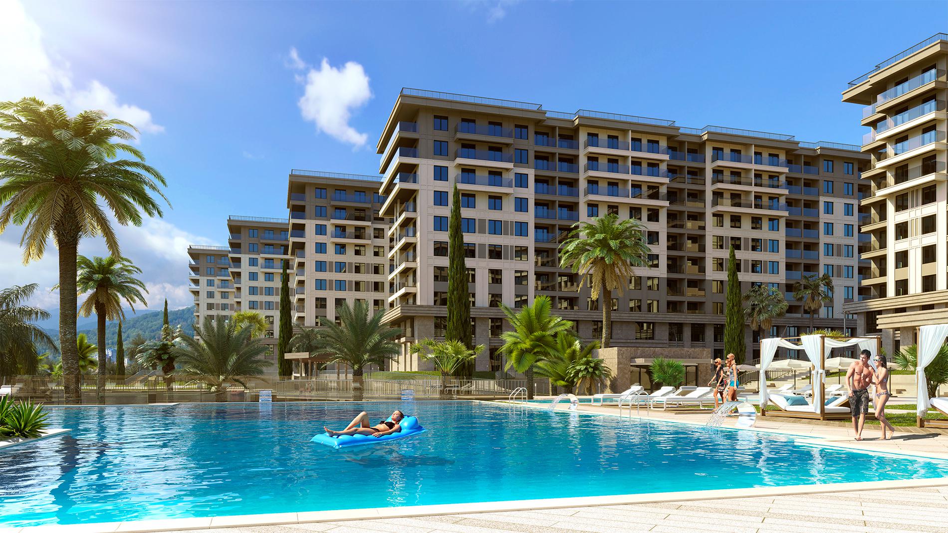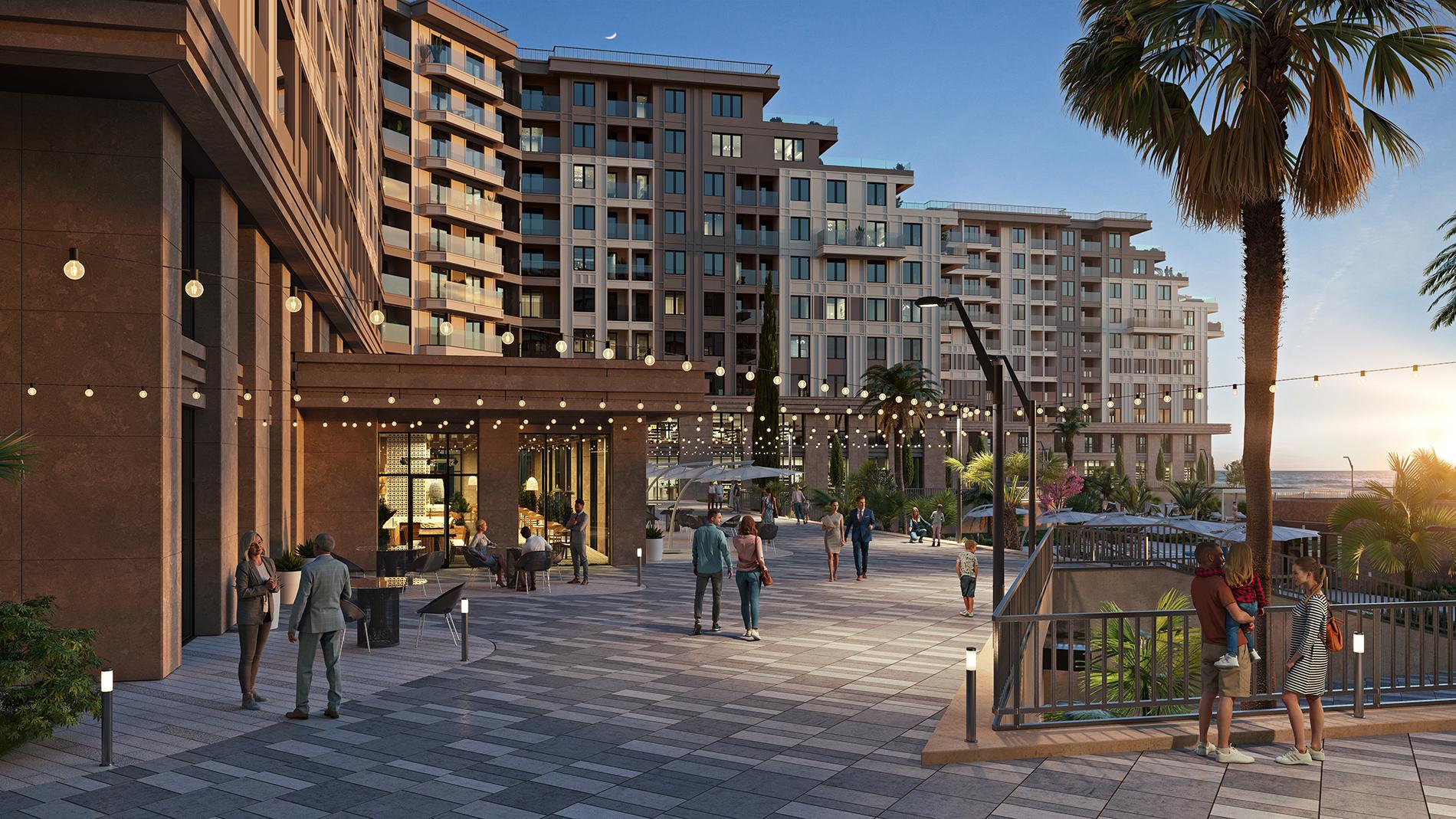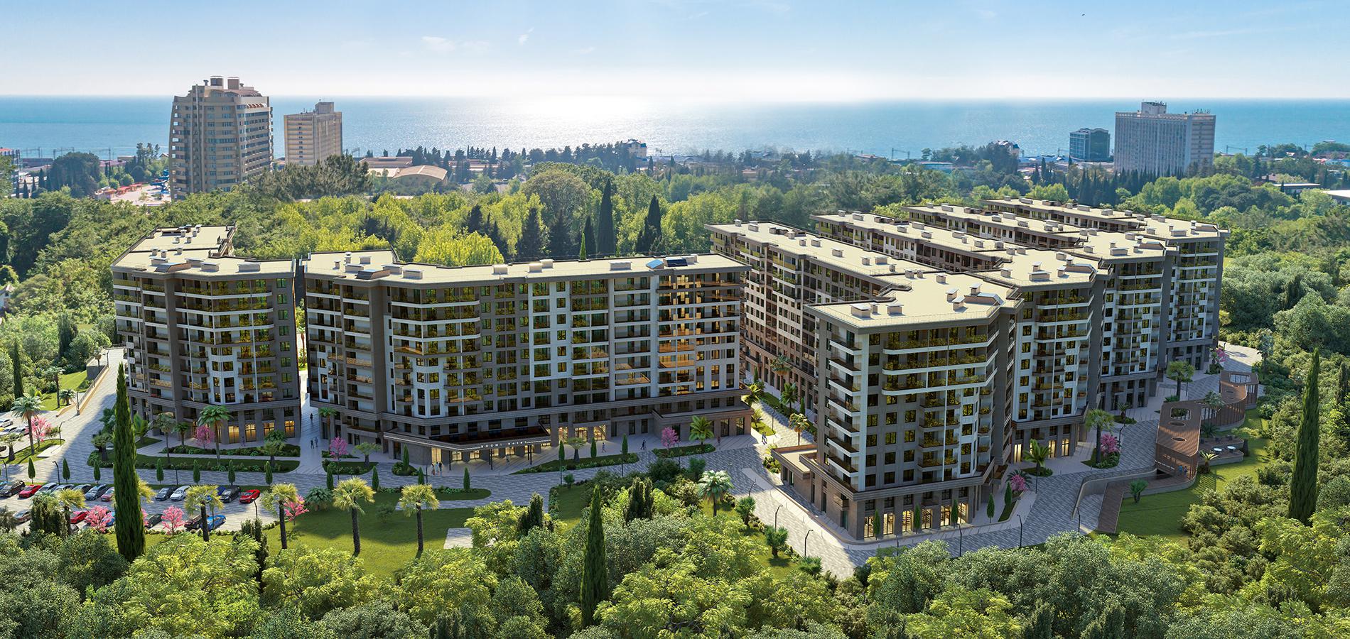 Комплекс располагает благоустроенной территорией площадью 4,5 га, разработанной дизайн-бюро Cora. В 7 минутах езды на машине расположено море. Внутри комплекса есть современные экологичные детские площадки от бренда «Тайга», аллеи с цветниками и кустарниками для прогулок, благоустроенная набережная с шезлонгами и перголами, а также спортивные зоны для любителей пляжного волейбола, бадминтона и йоги.