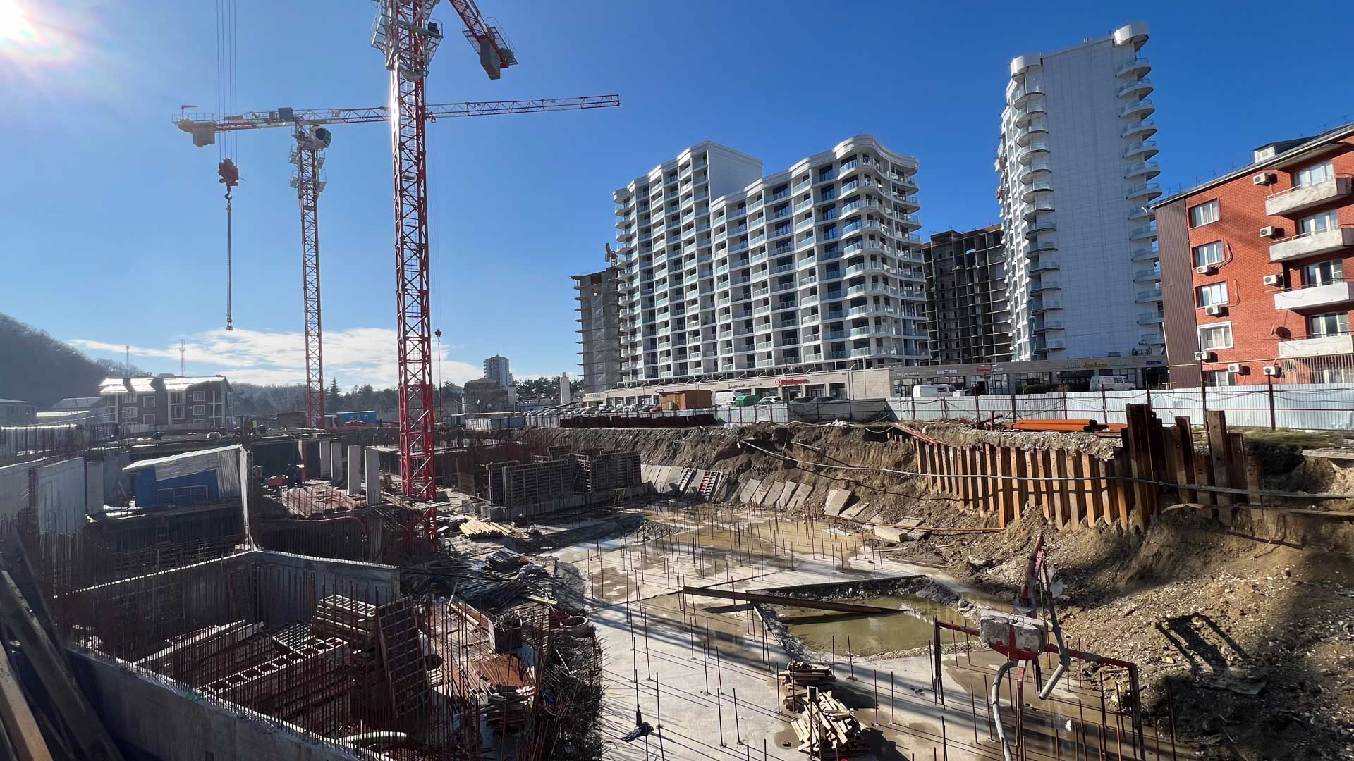 Расположение ЖК выгодно отличается развитой курортной инфраструктурой: в шаговой доступности находятся супермаркеты (ближайший — в 600 метрах), спортивные центры и кафе, что создаёт комфортные условия для повседневной жизни и отдыха. Во дворе комплекса обустроены детская и спортивная площадки — они станут отличным местом для активного досуга жителей всех возрастов. Для автовладельцев предусмотрен открытый паркинг.