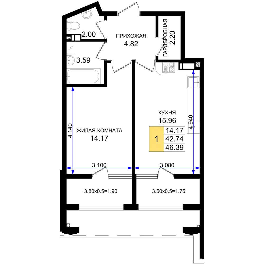 1-комнатная квартира, 49.32 м², 6 эт.