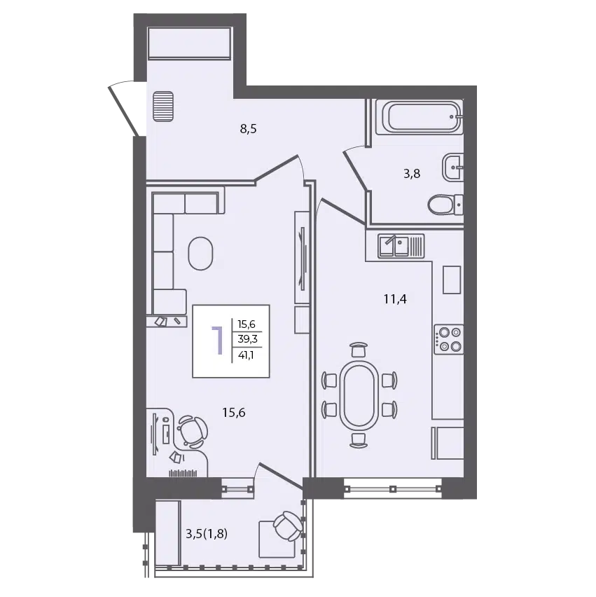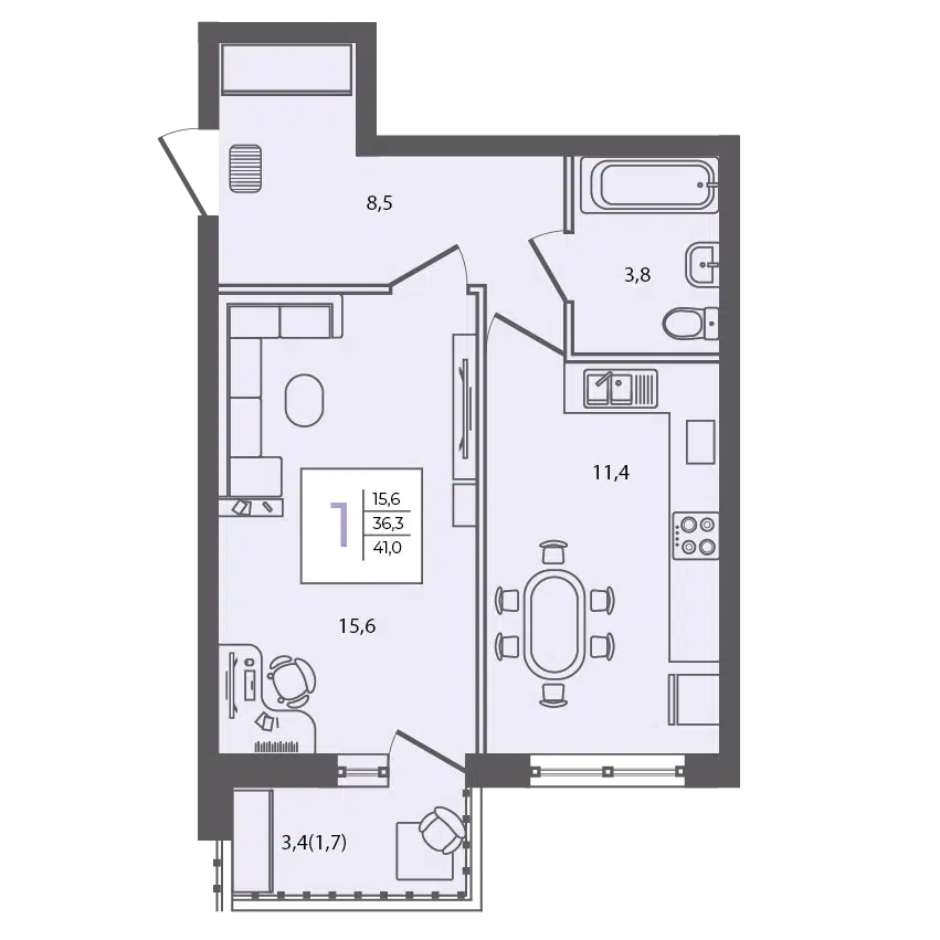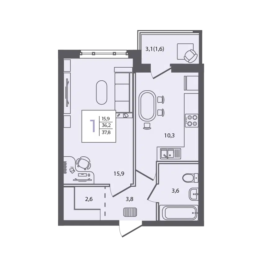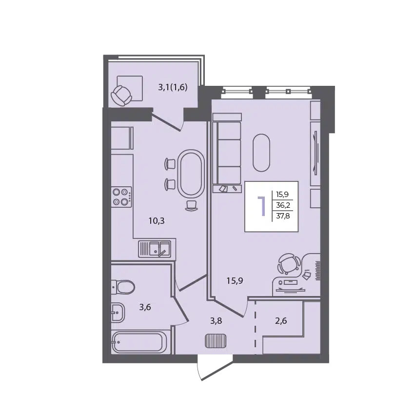 1-комнатная, 37.80 м²