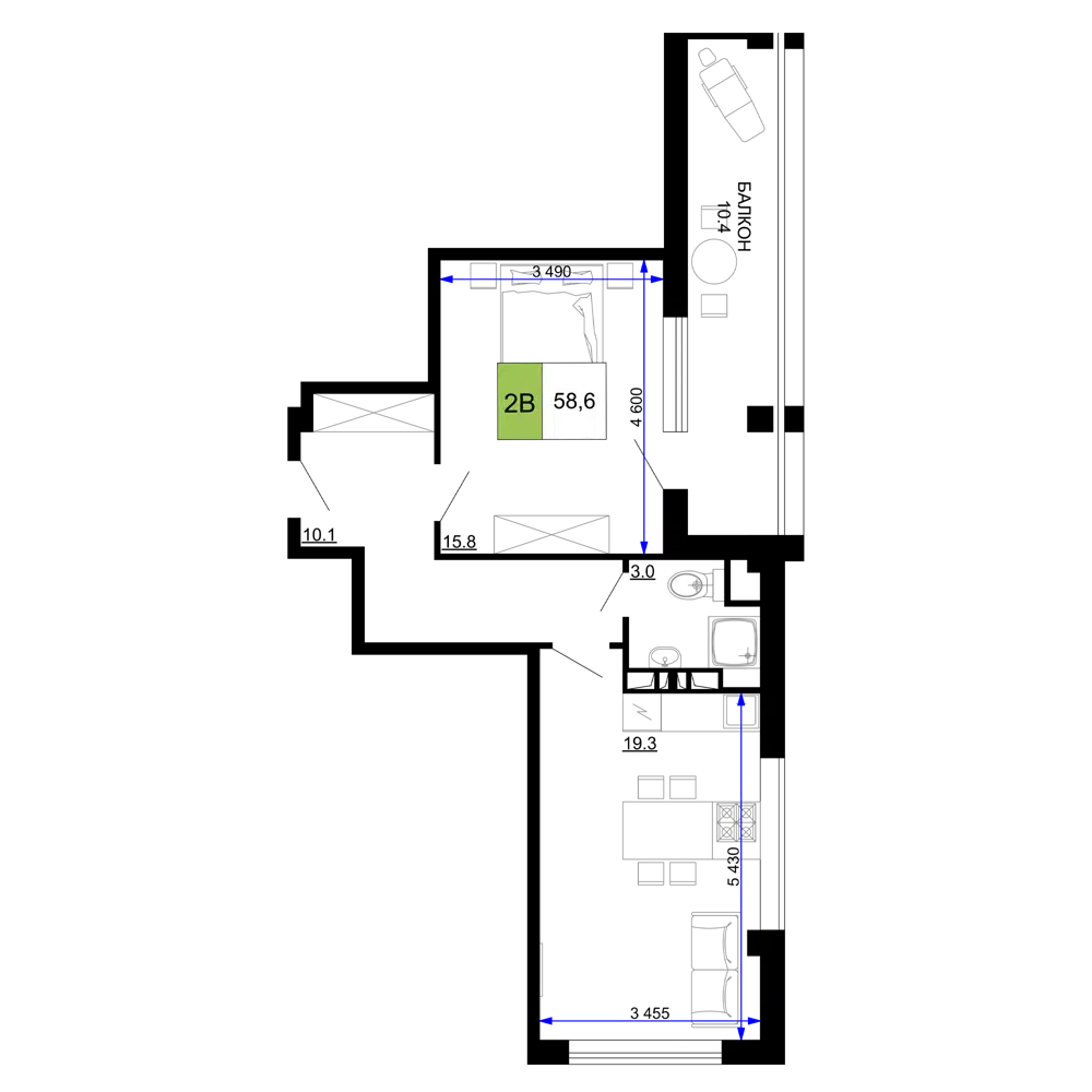 2-комнатная, 58.60 м²