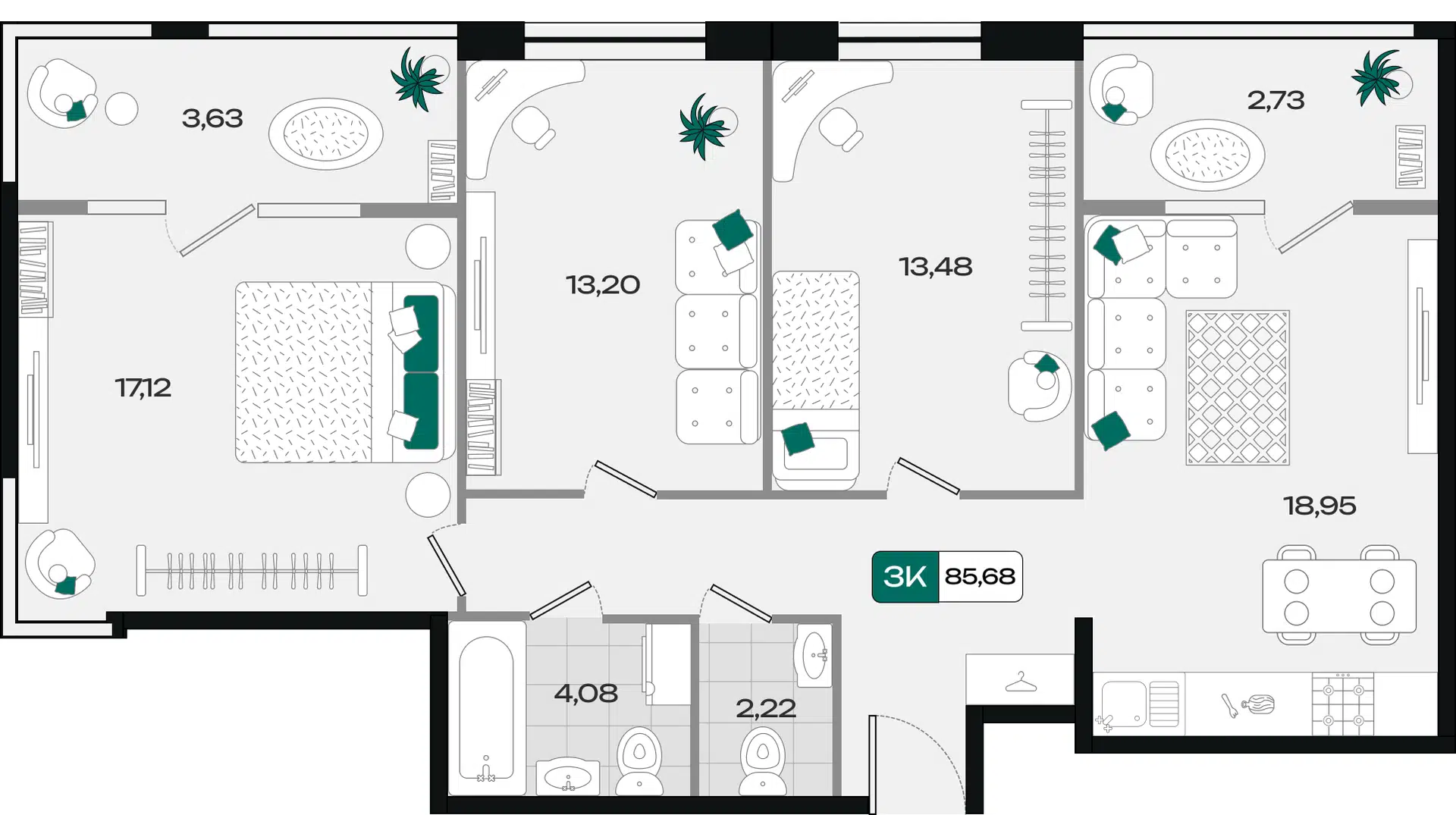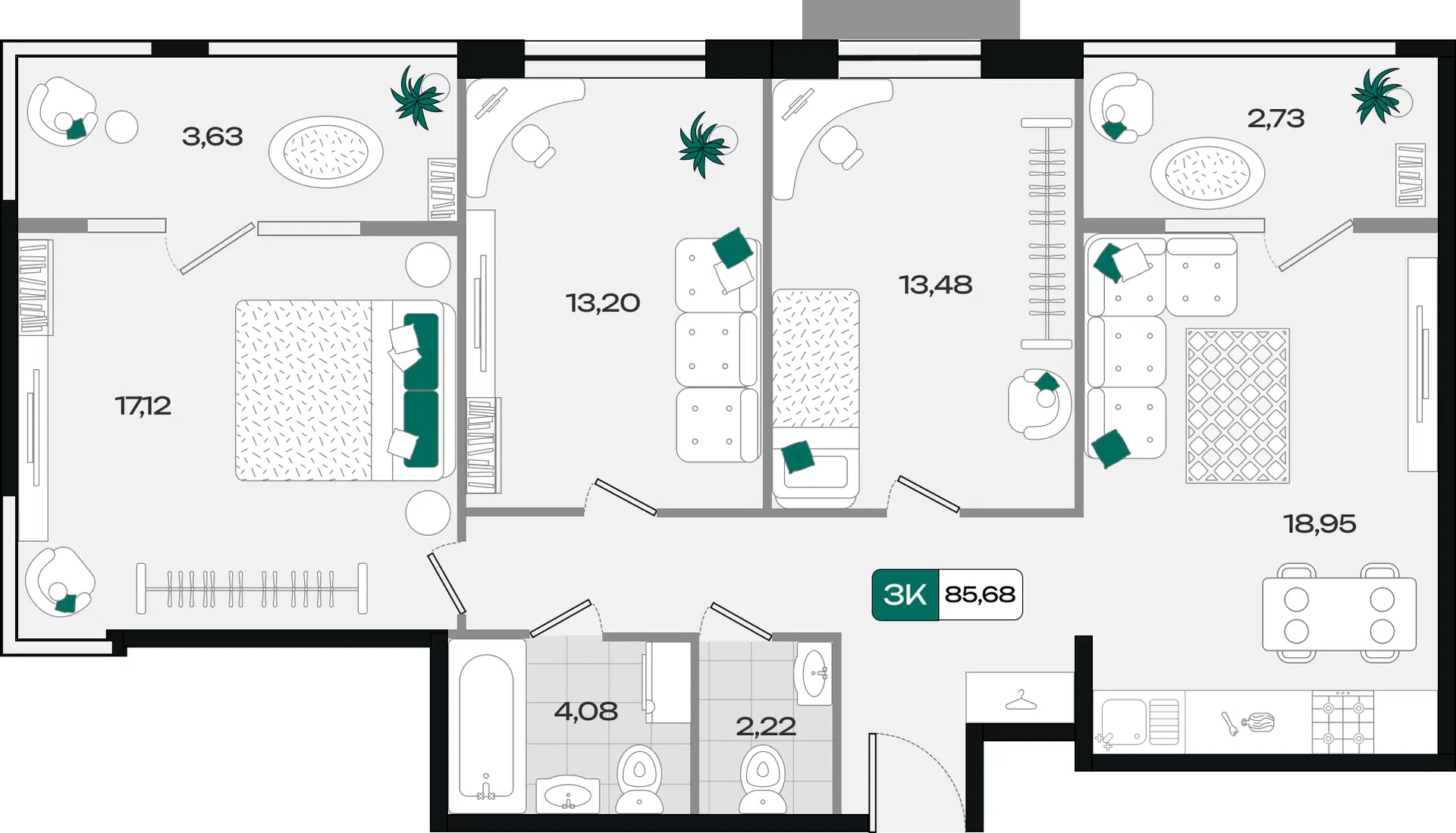 3-комнатная квартира, 85.96 м², 1 эт.