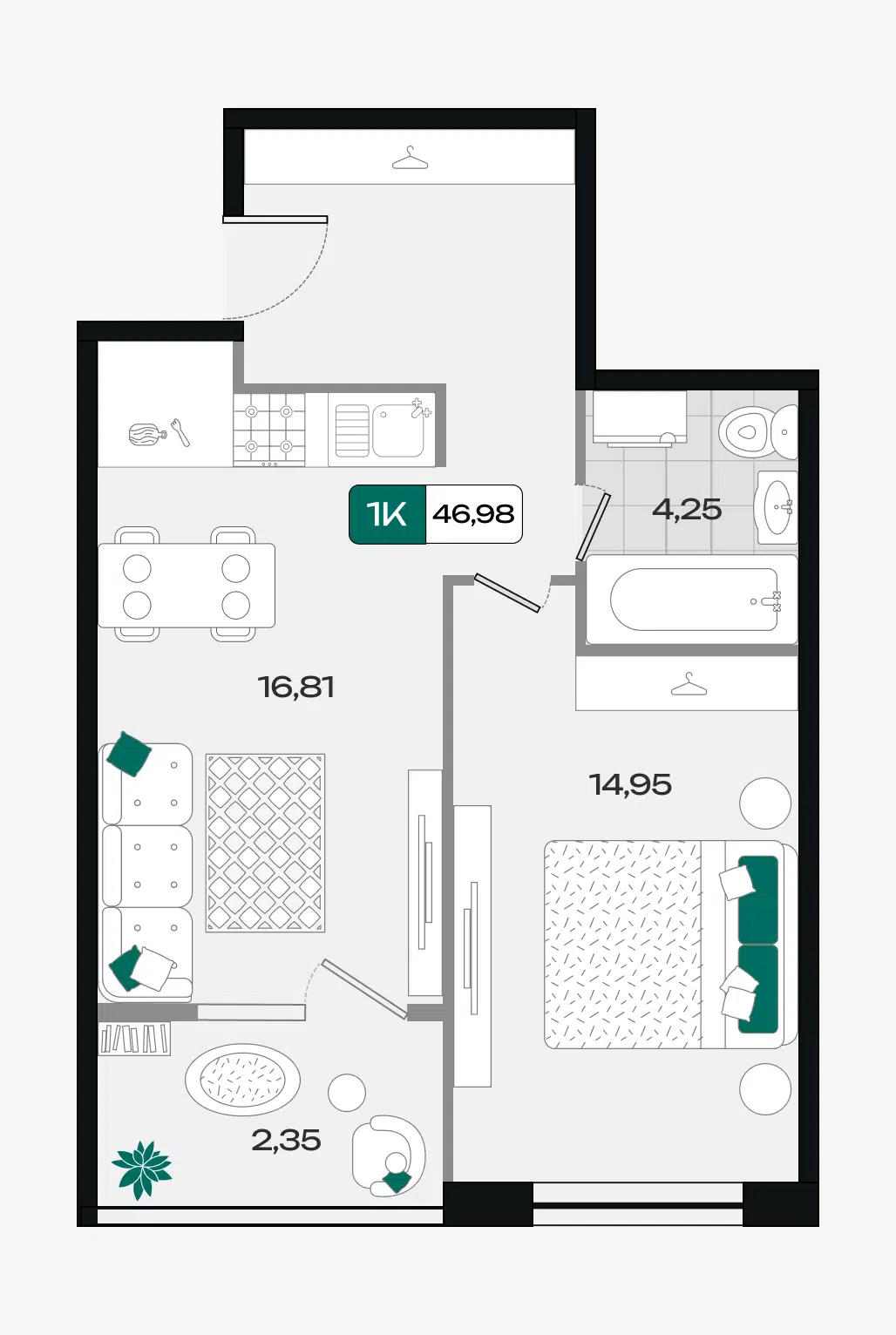1-комн. квартира, 46.79 м²