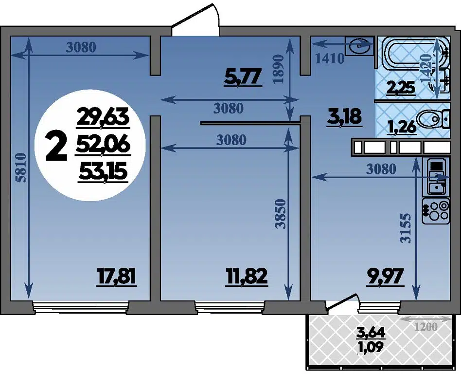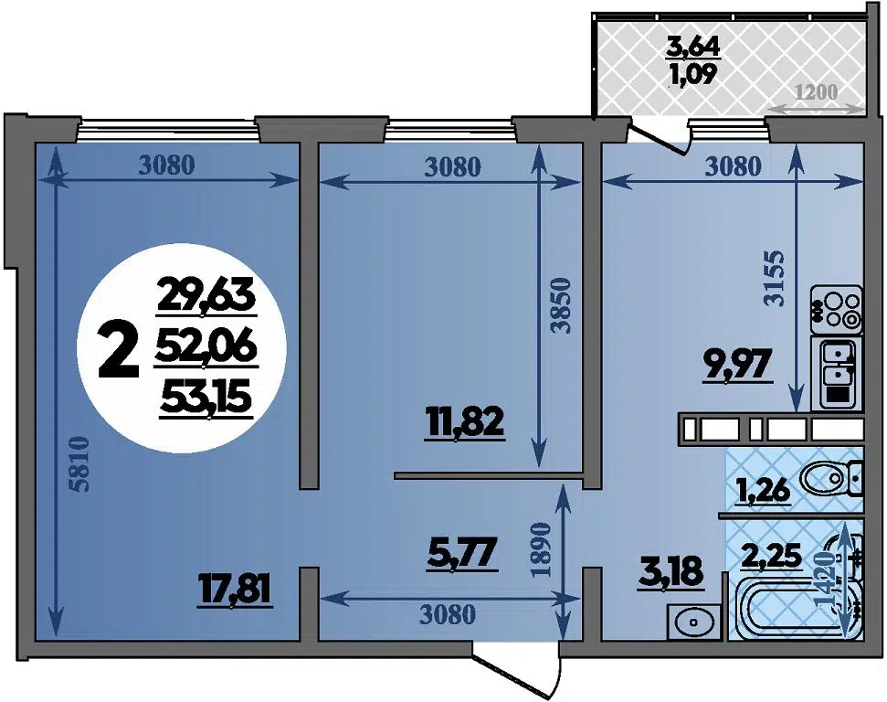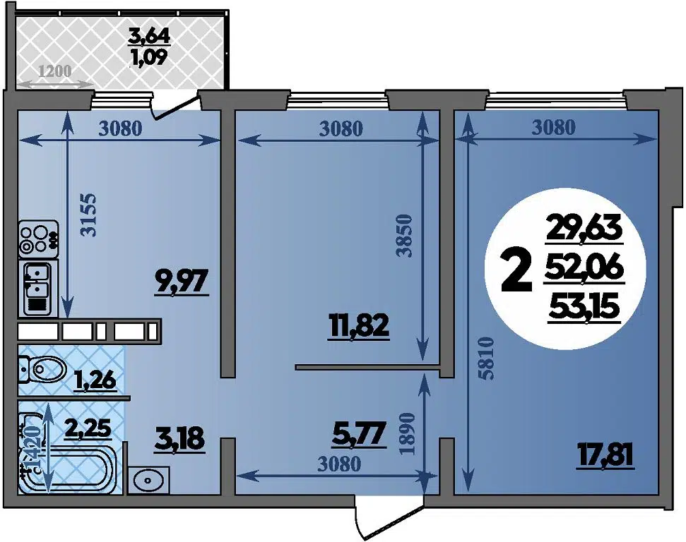 2-комнатная, 53.15 м²