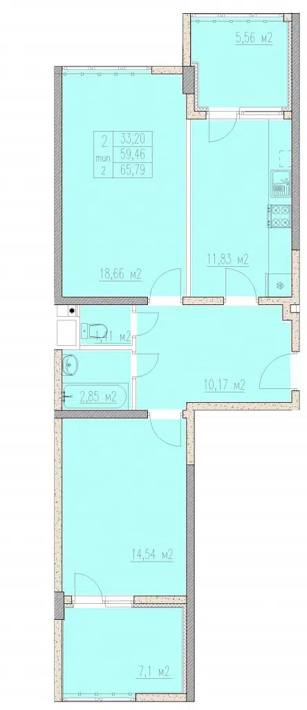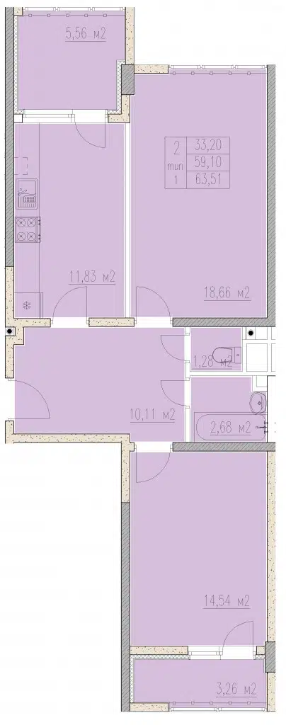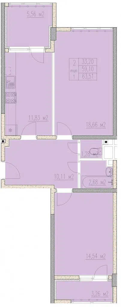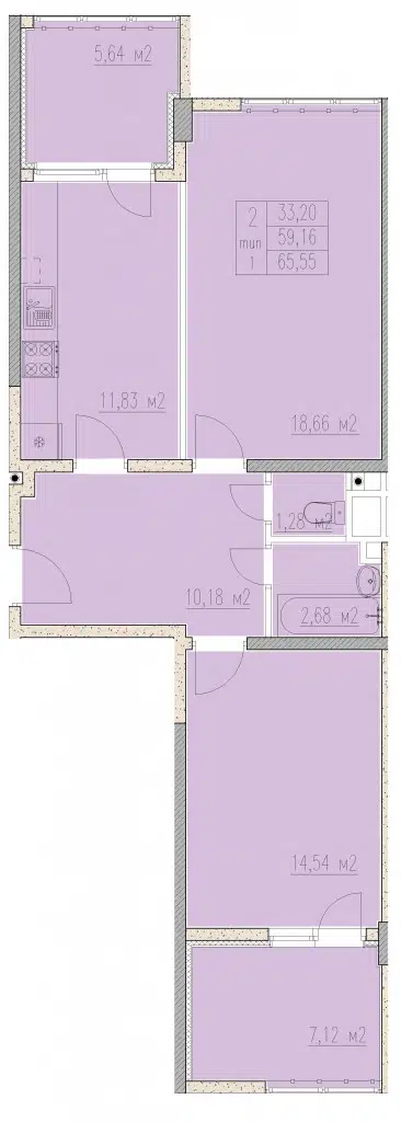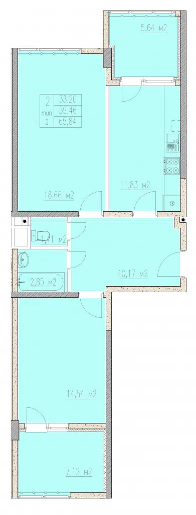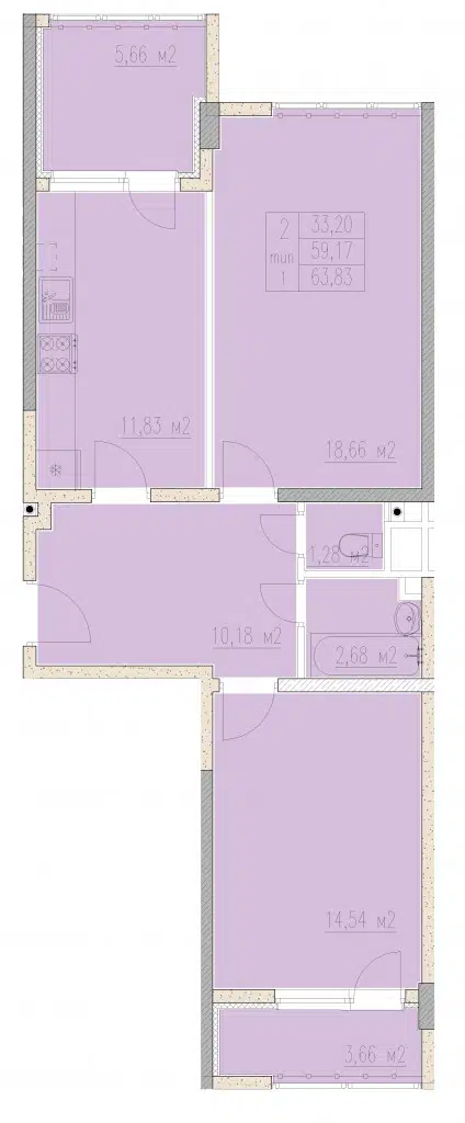 2-комнатная квартира, 63.55 м², 2 эт.