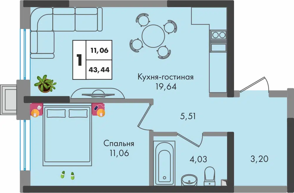 1-комн. квартира, 43.44 м²