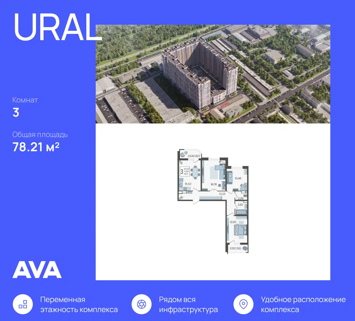3-комн. квартира, 78.21 м²