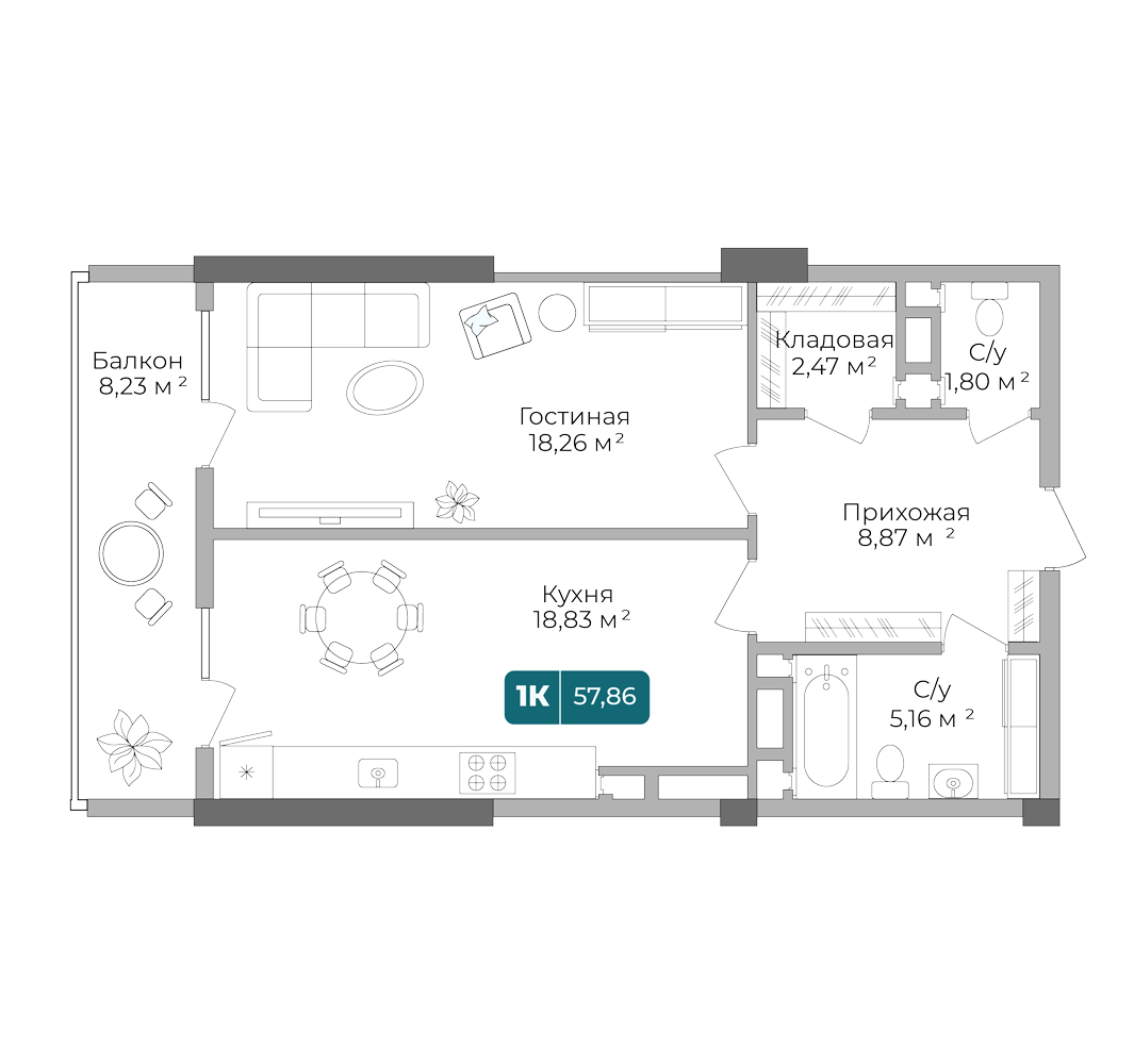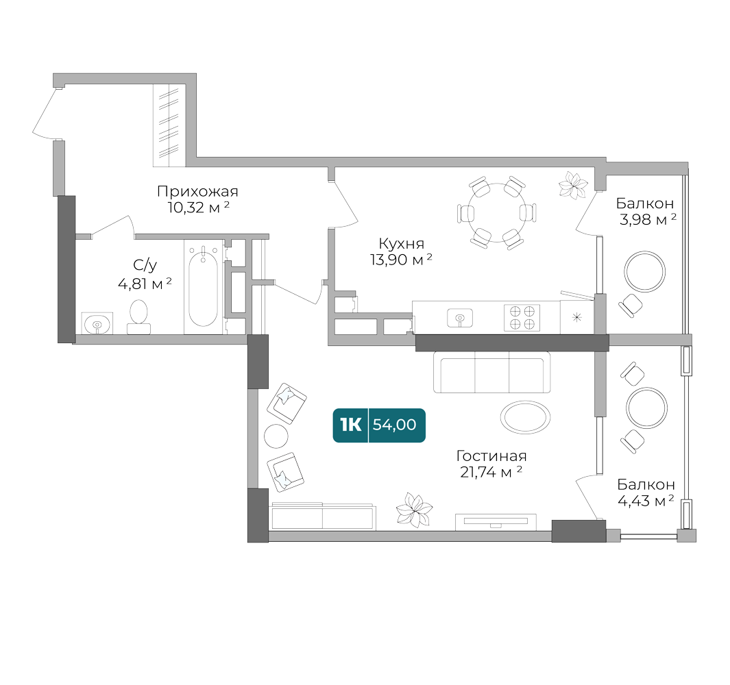 1-комнатная квартира, 53.55 м², 3 эт.