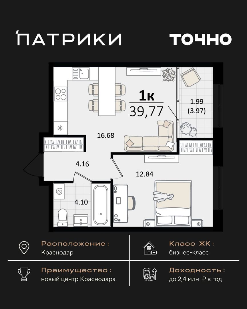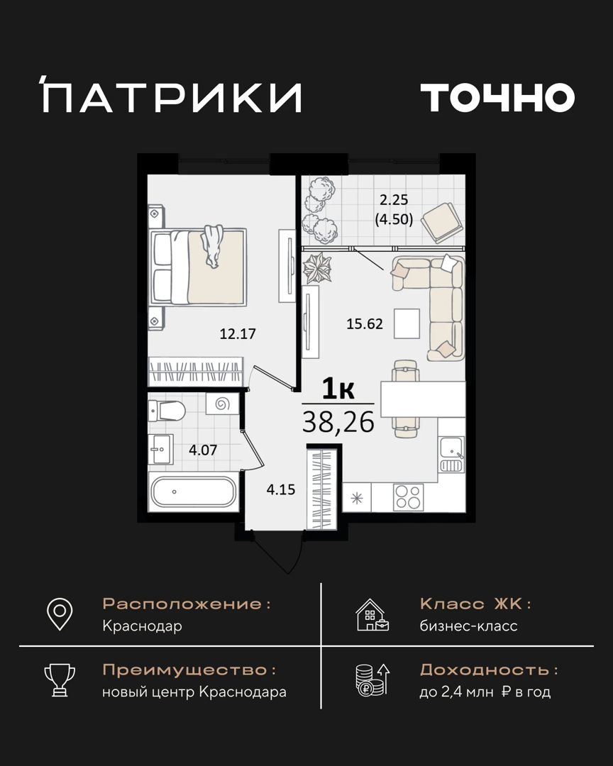 1-комнатная квартира, 113.05 м², 18 эт.