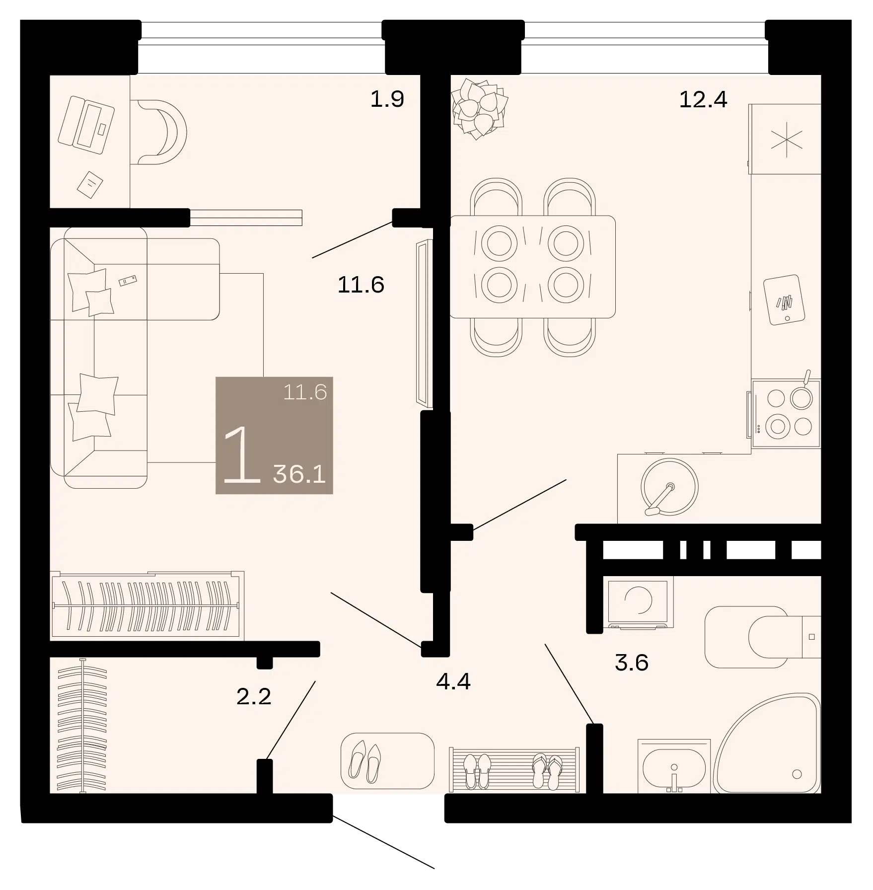 1-комнатная, 34.20 м²