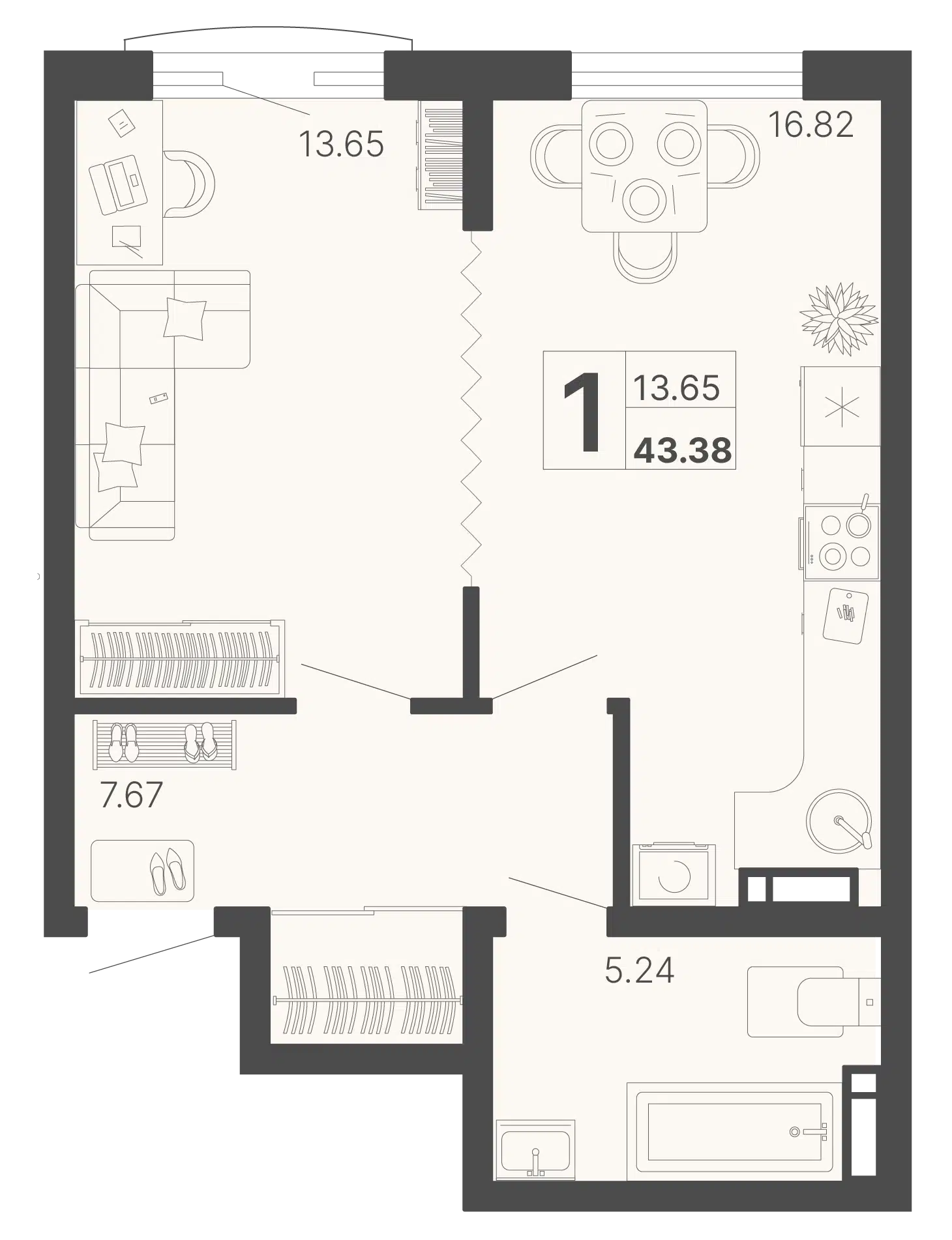 1-комнатная квартира, 43.38 м², 13 эт.