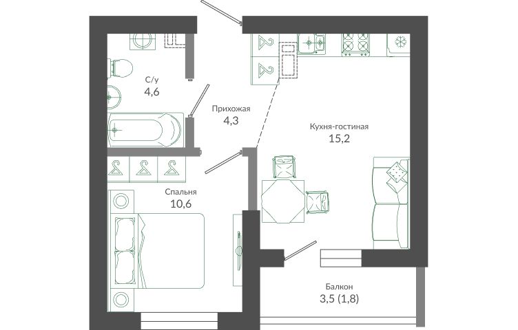 1-комнатная квартира, 37.50 м², 9 эт.
