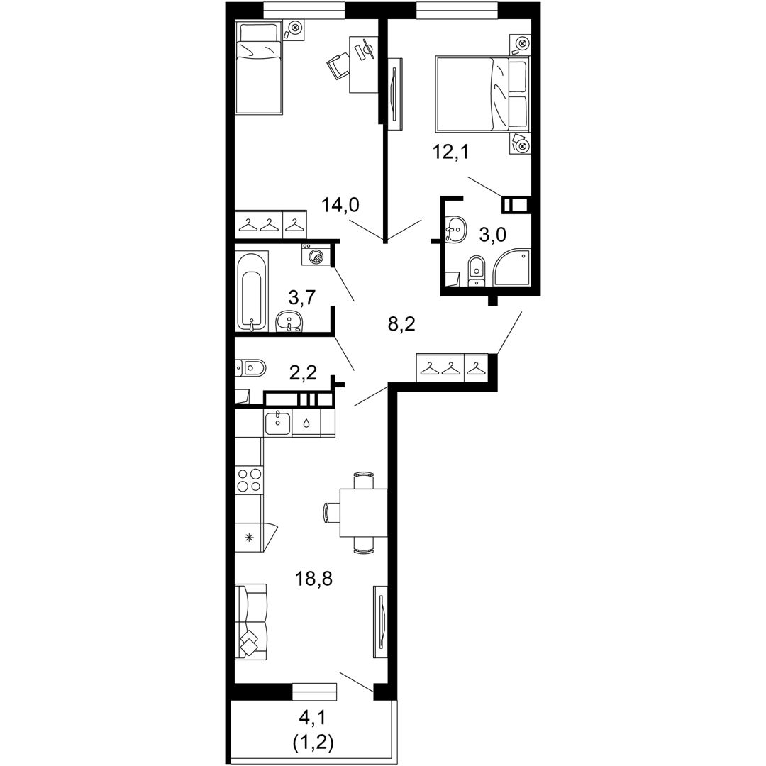 2-комнатная квартира, 63.80 м², 1 эт.