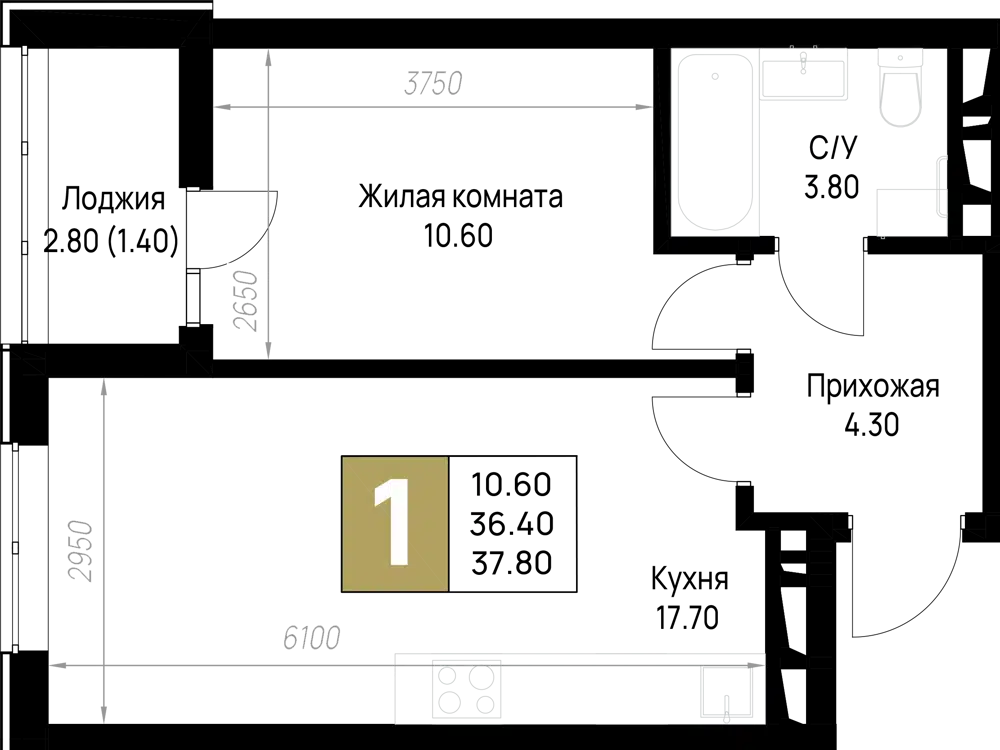1-комнатная, 38.90 м²
