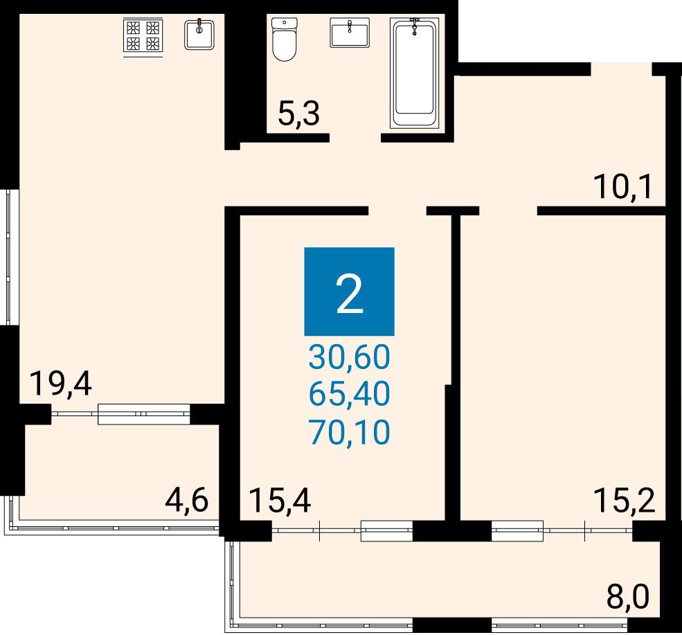 2-комнатная квартира, 65.40 м², 6 эт.