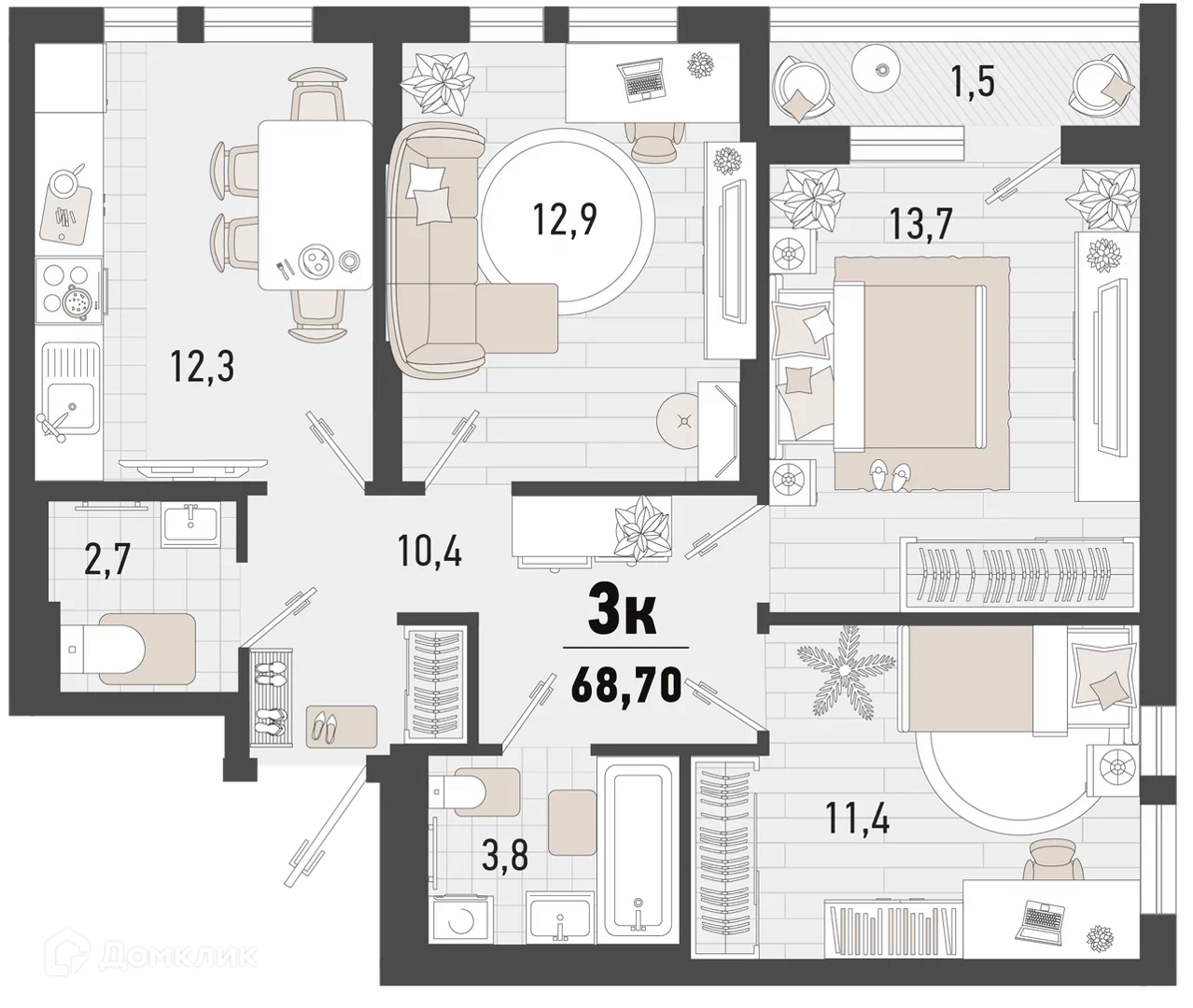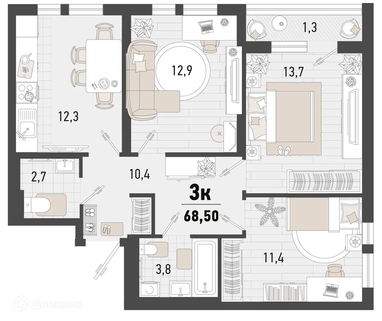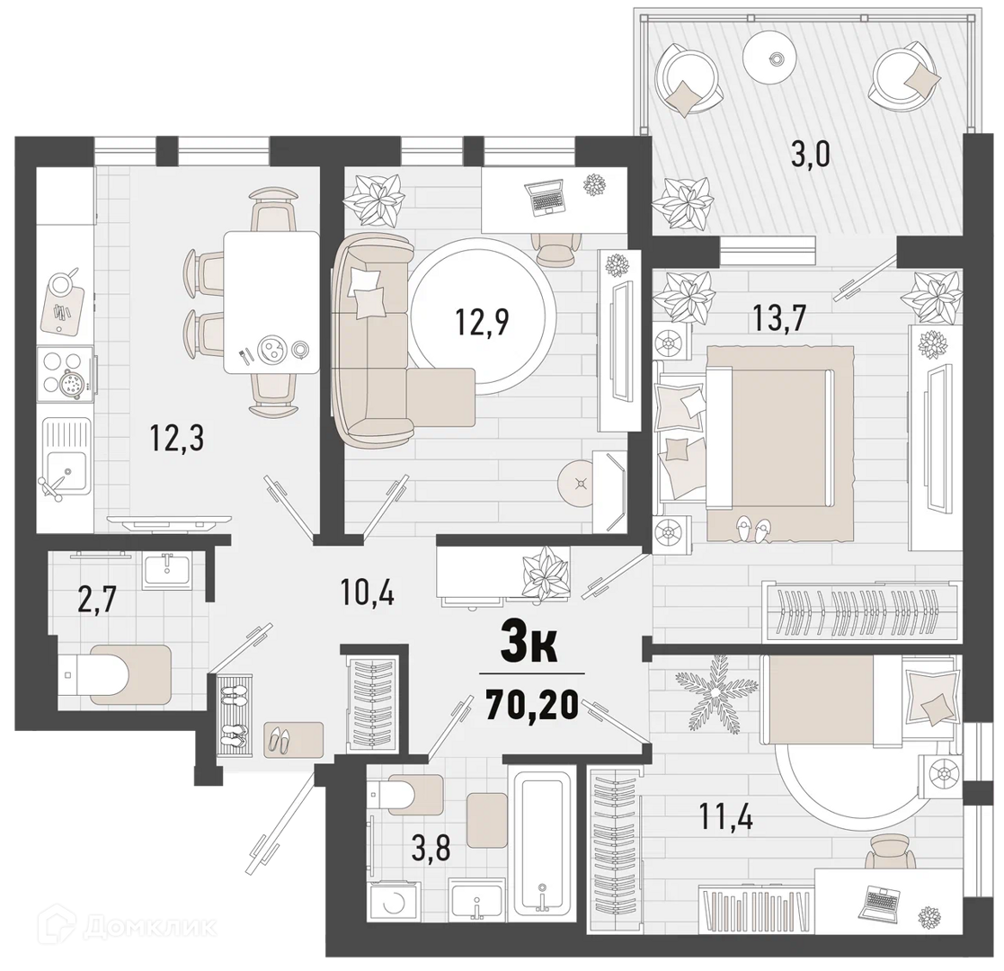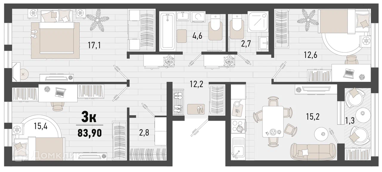 3-комнатная квартира, 86.10 м², 1 эт.
