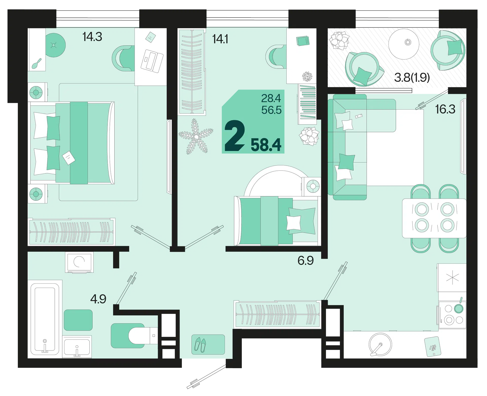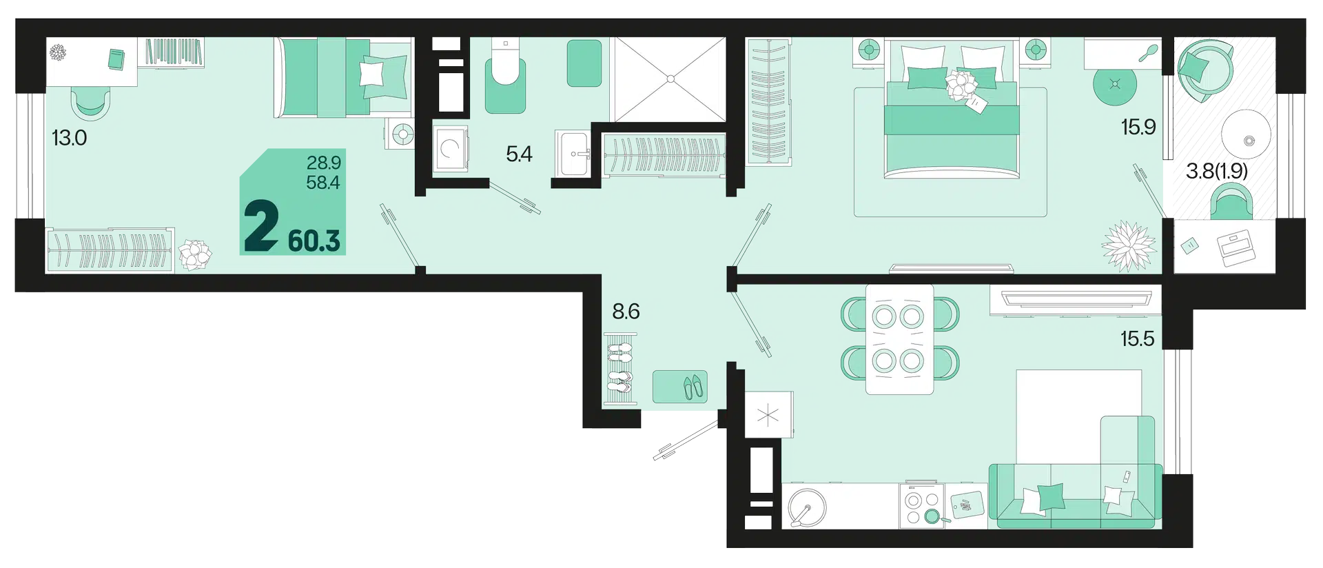 2-комнатная, 60.30 м²