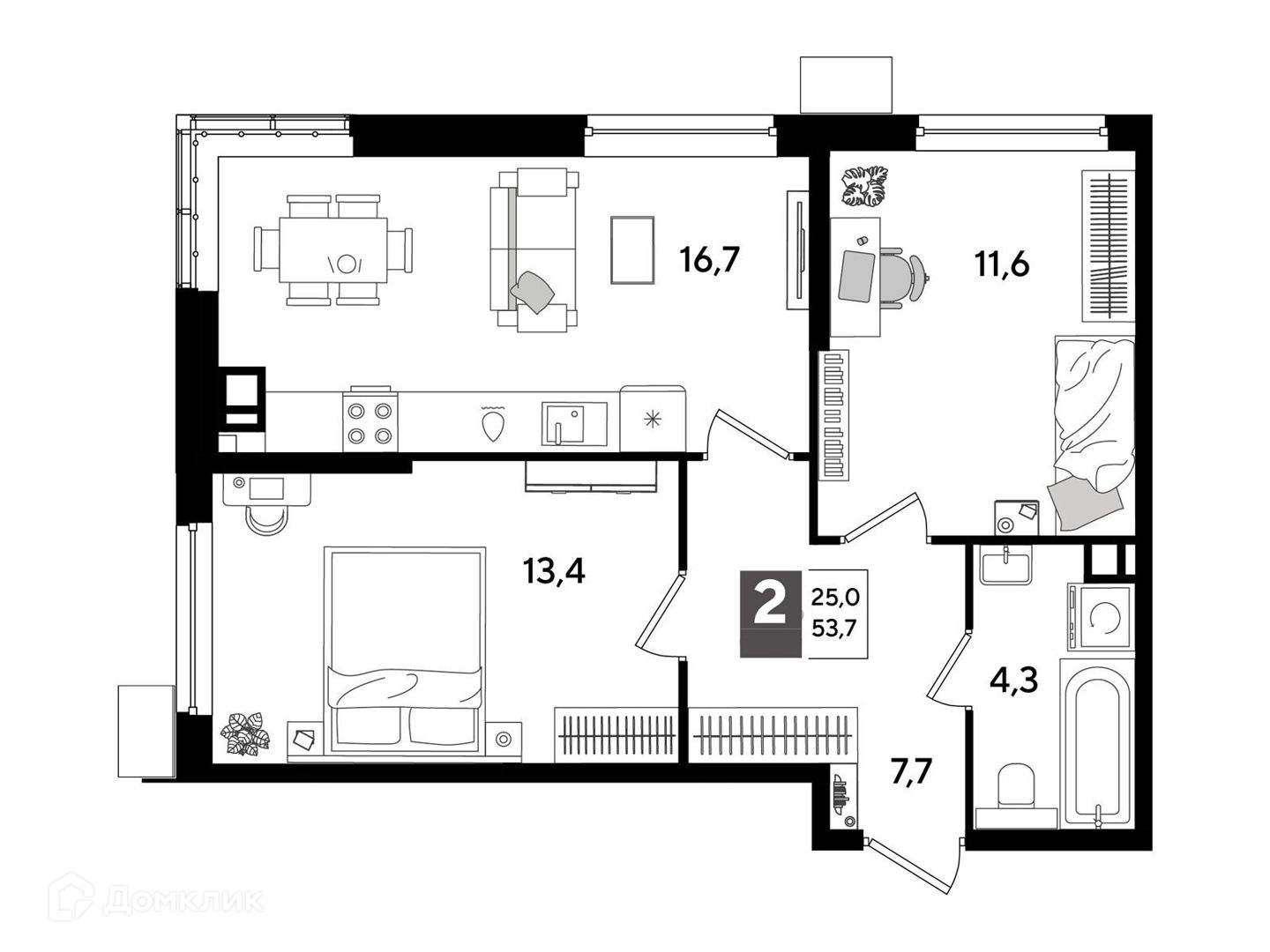 2-комнатная, 53.50 м²