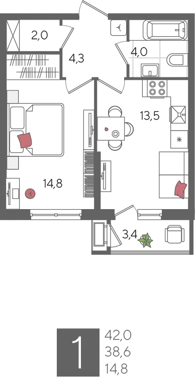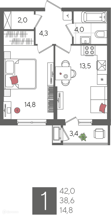 1-комнатная квартира, 42.00 м², 7 эт.