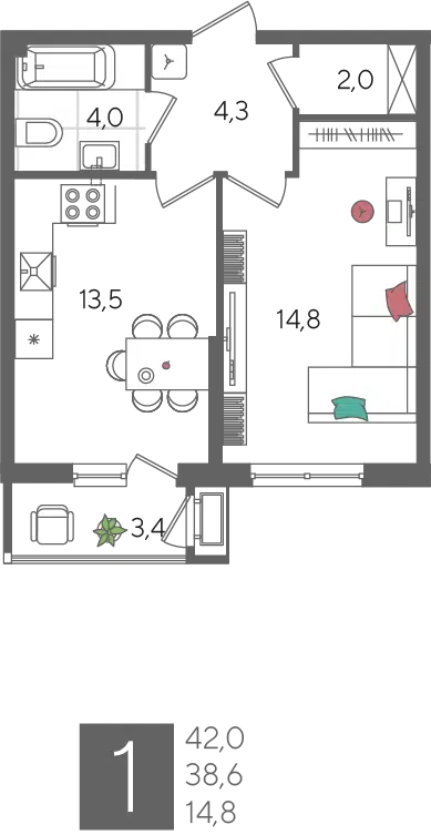 1-комнатная квартира, 42.00 м², 6 эт.