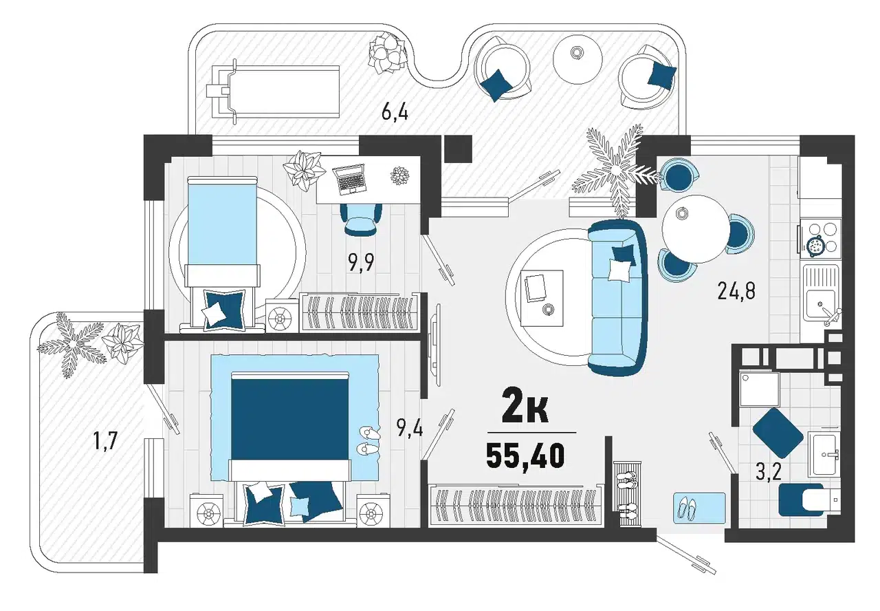 2-комнатная, 62.90 м²