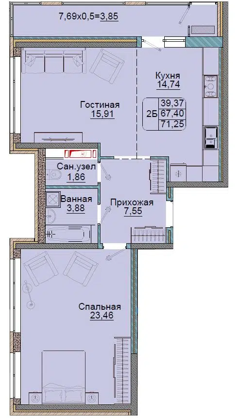 2-комнатная квартира, 71.25 м², 11 эт.