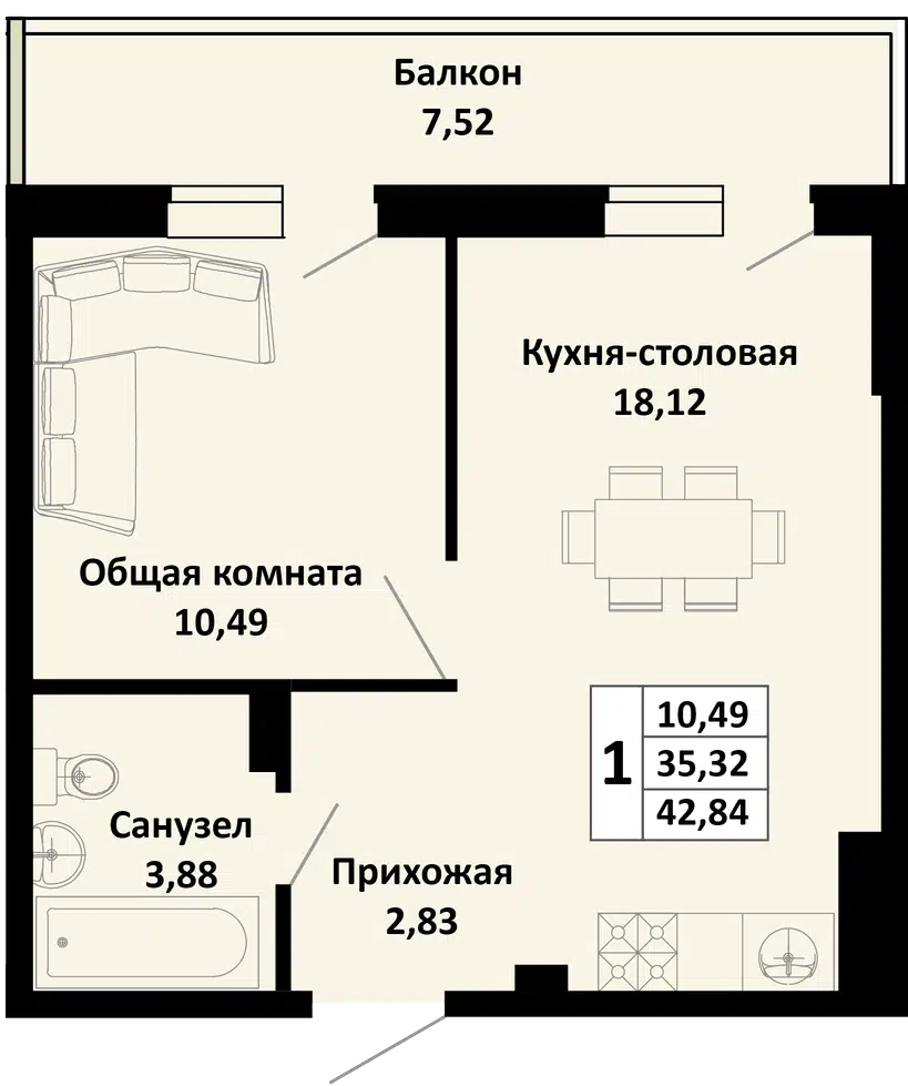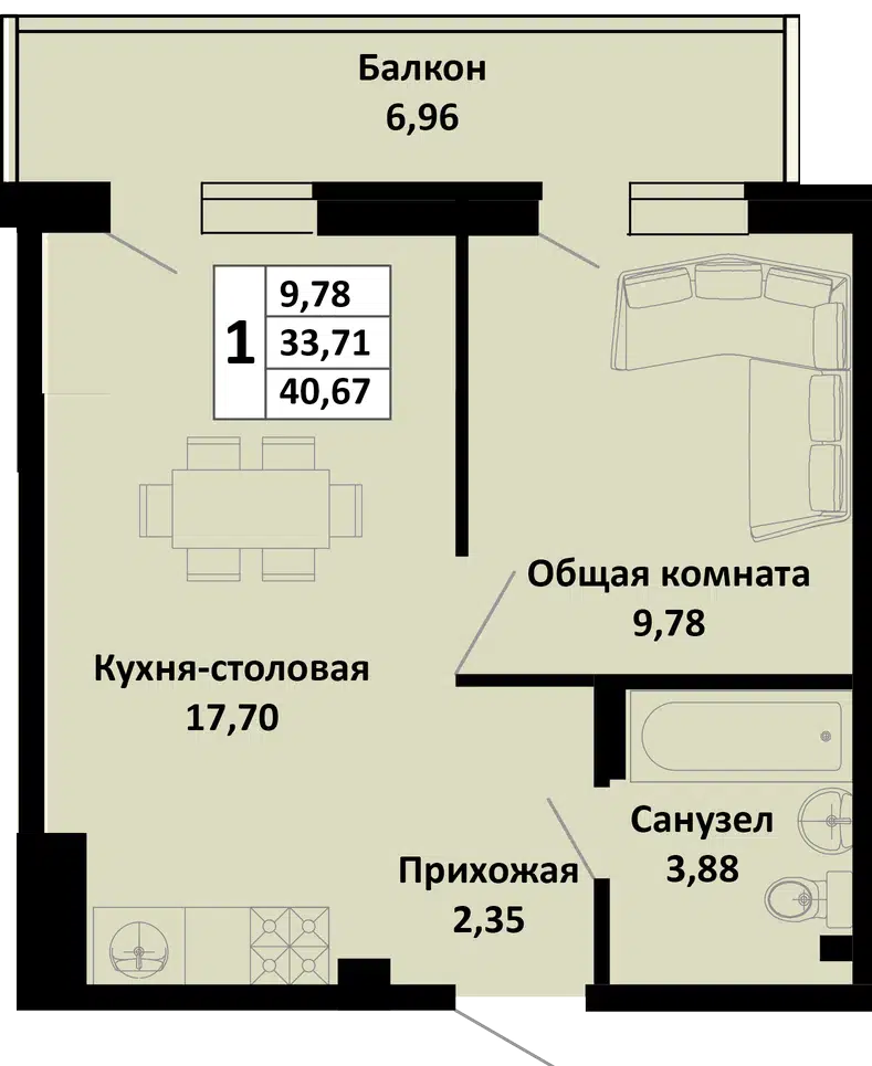 1-комнатная, 38.20 м²
