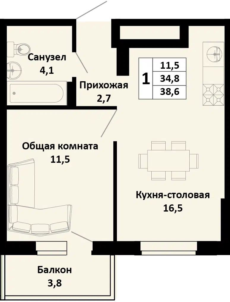 1-комнатная, 40.67 м²