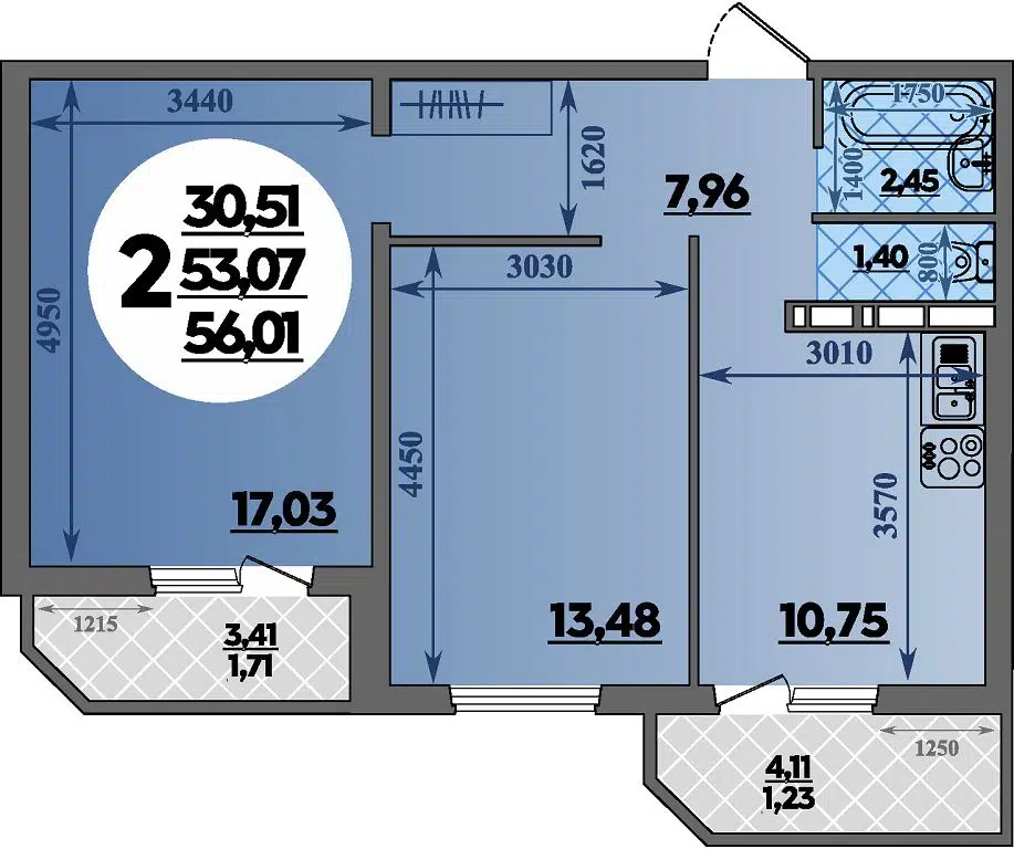 2-комнатная, 67.69 м²