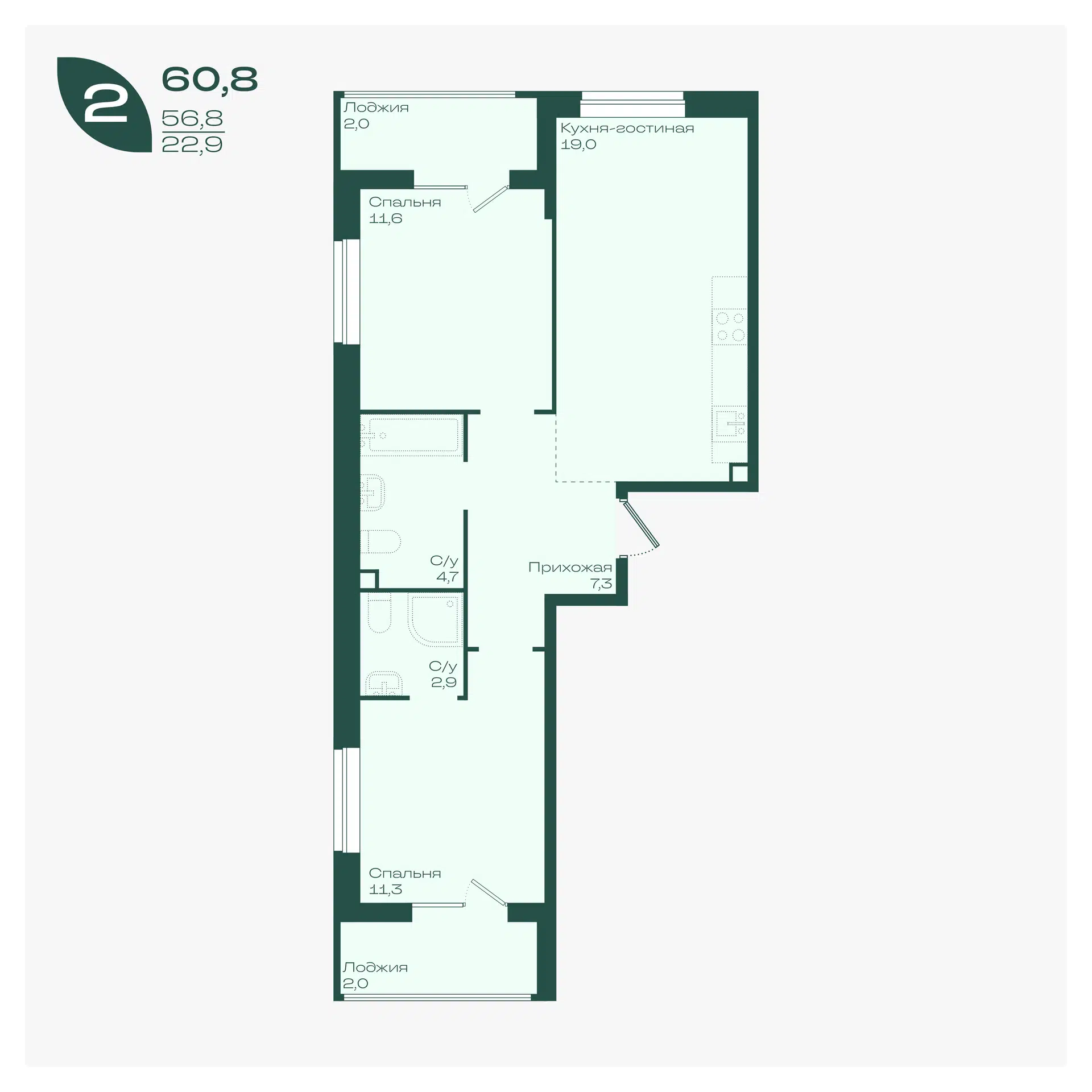 2-комнатная, 60.00 м²