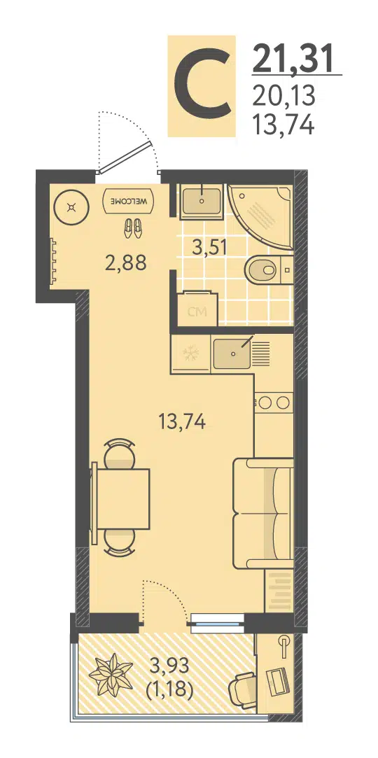 Студия, 21.50 м²