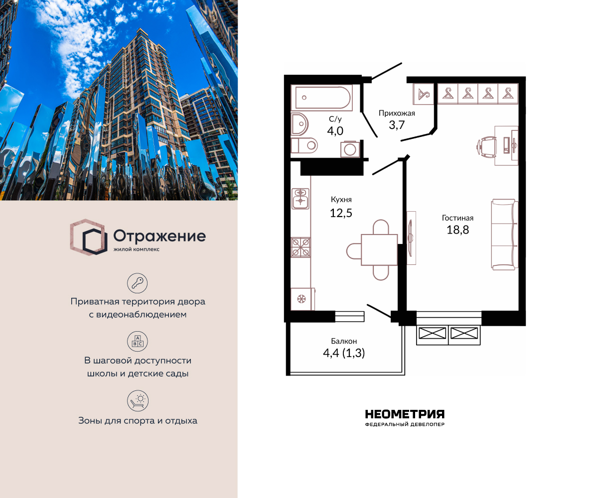 1-комнатная, 38.10 м²