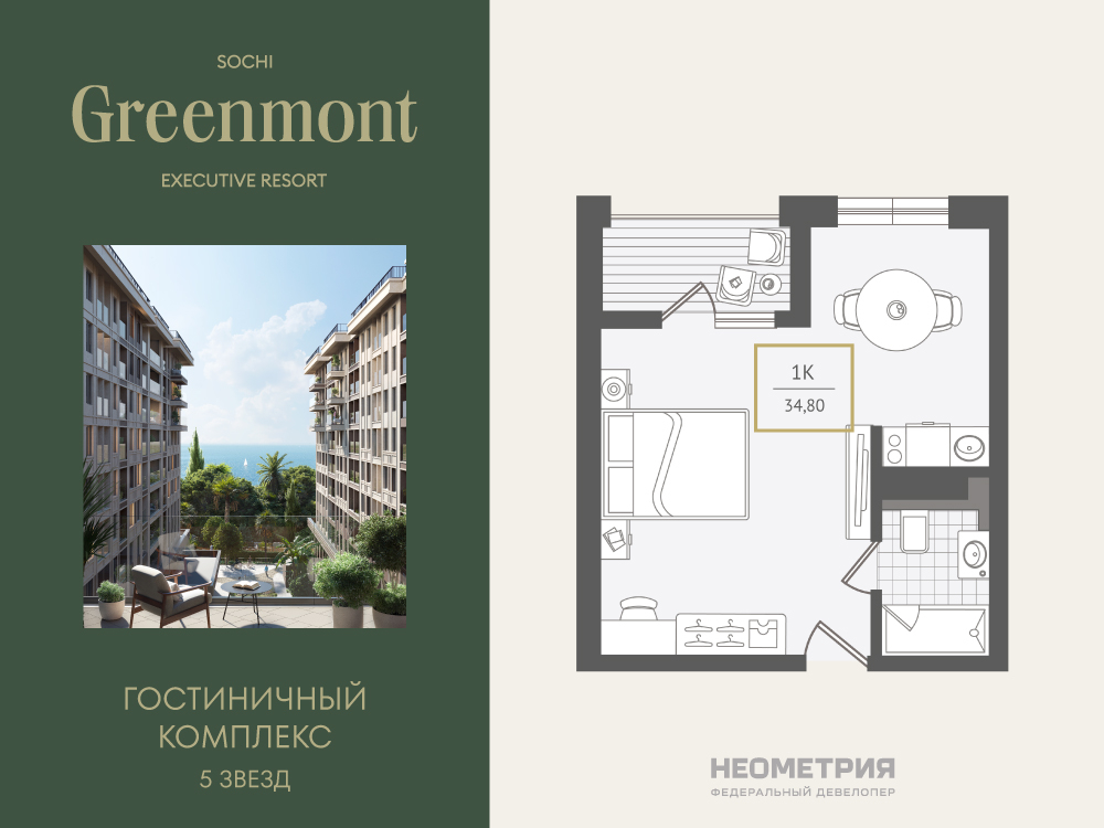 1-комнатная квартира, 34.90 м², 9 из 10 эт.