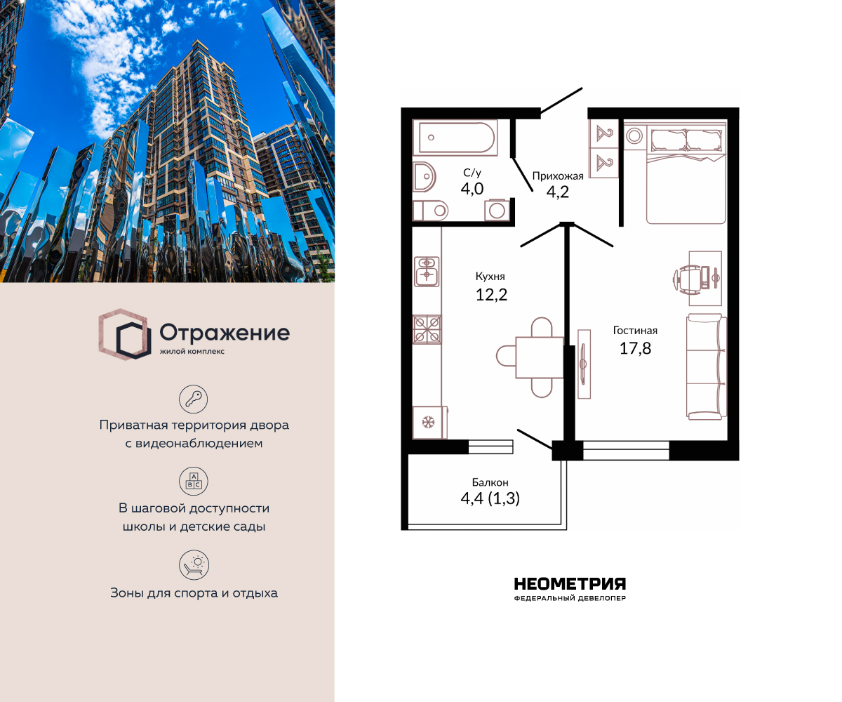 1-комнатная, 39.30 м²