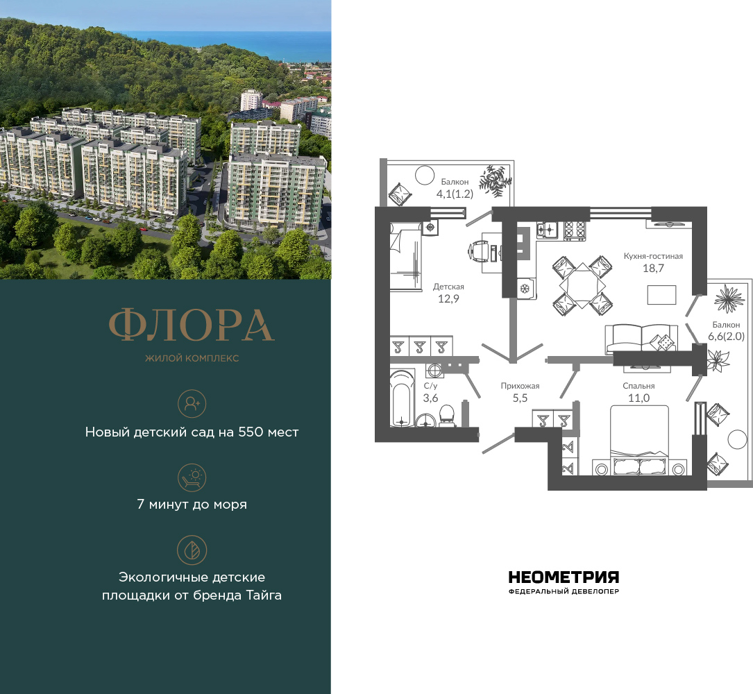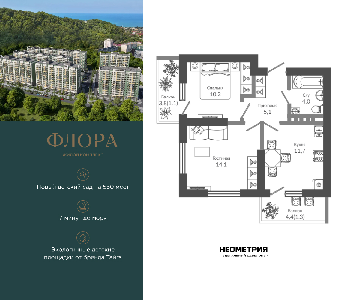 2-комнатная, 56.00 м²