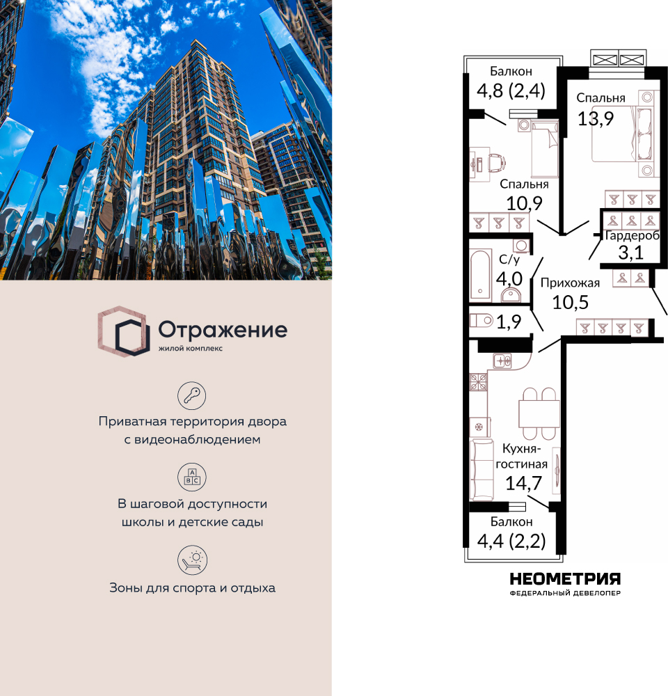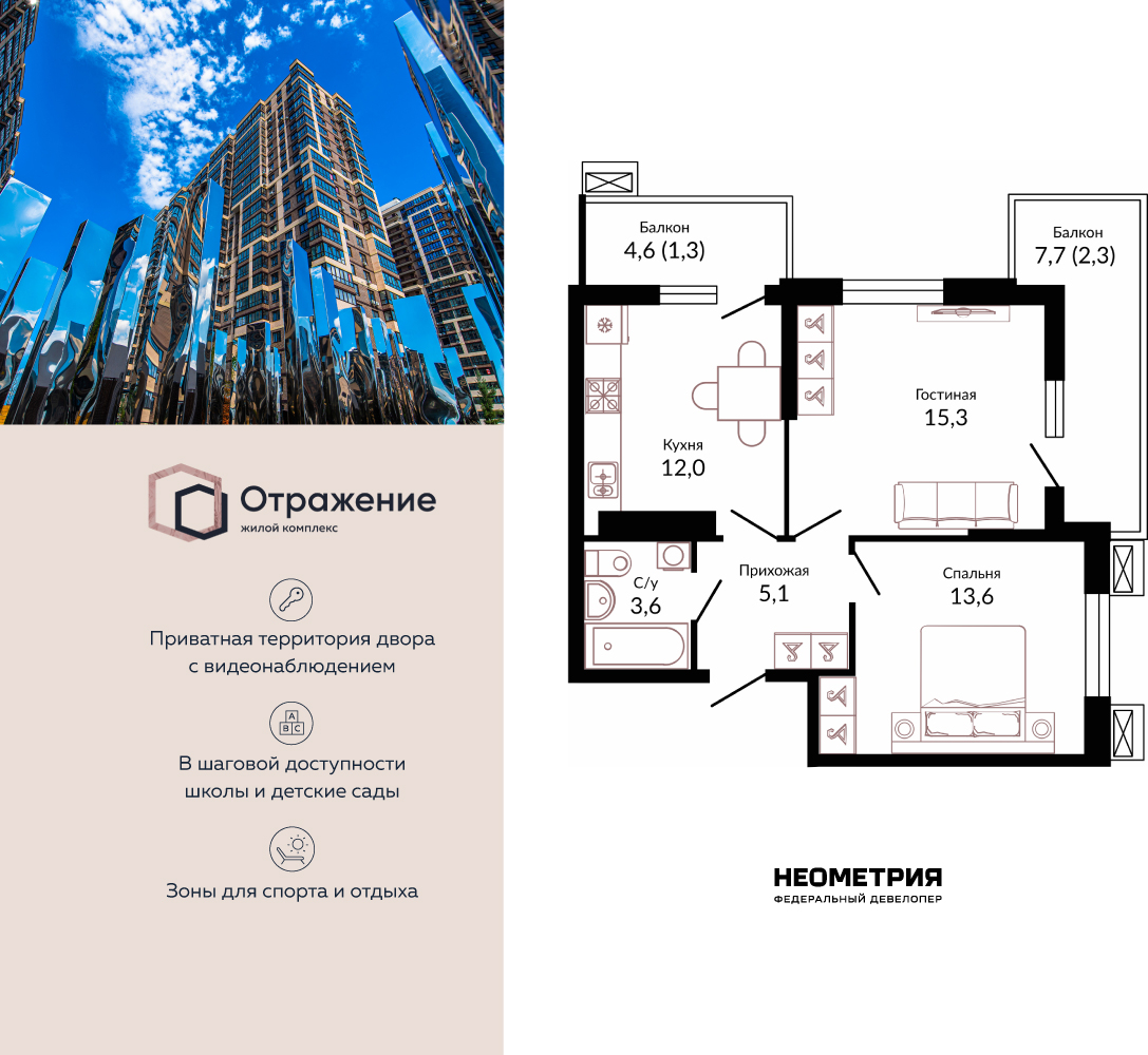 2-комнатная, 57.70 м²