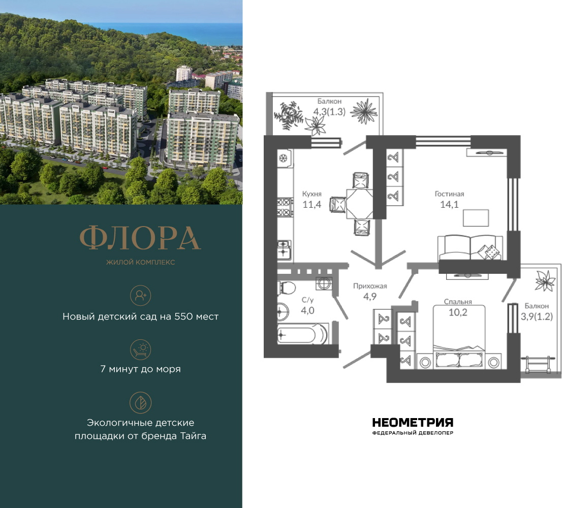 2-комнатная квартира, 46.10 м², 2 из 12 эт.