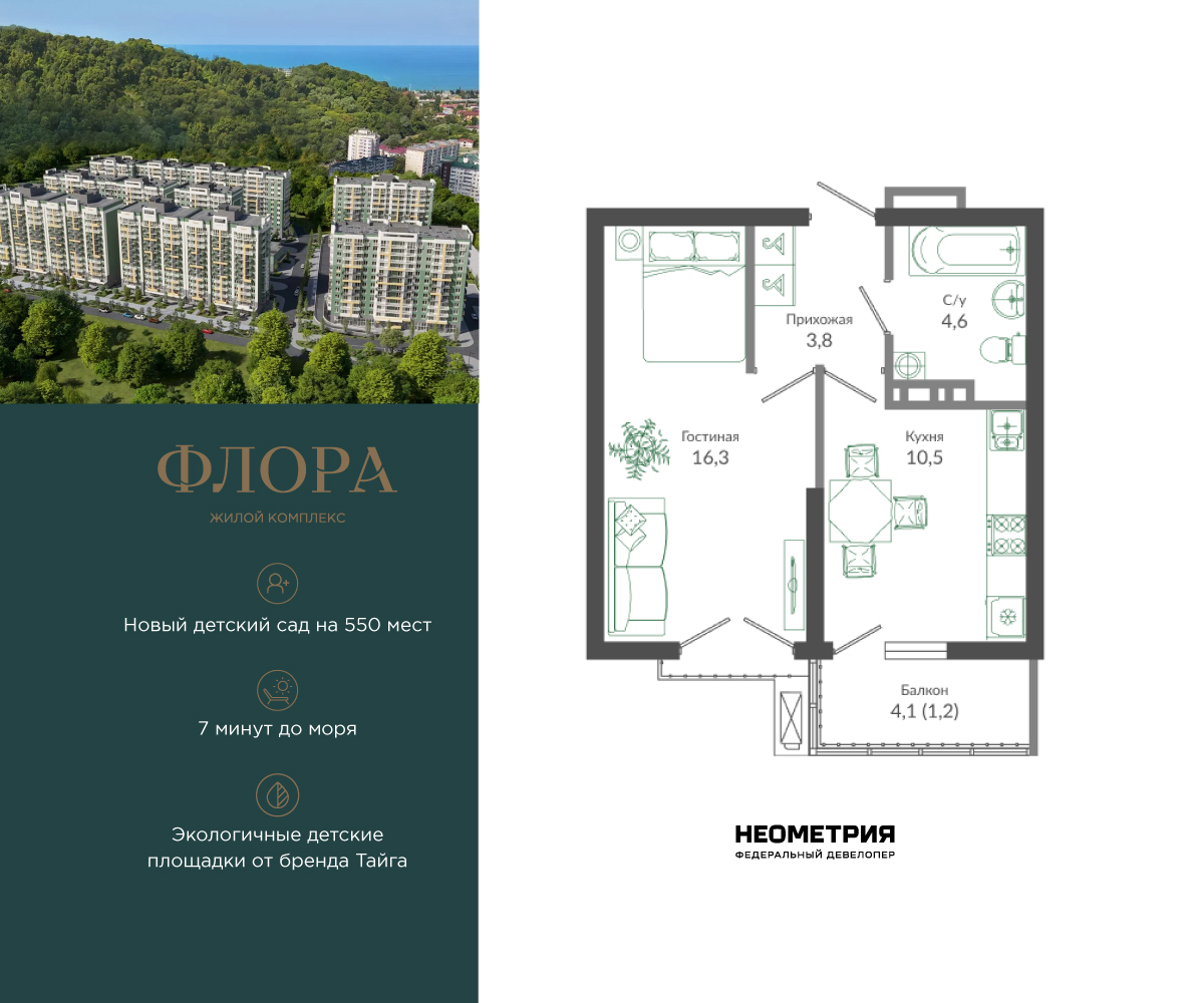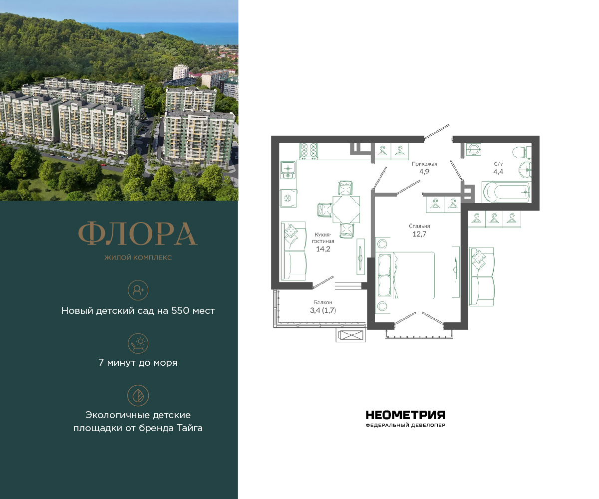 1-комнатная квартира, 33.60 м², 4 из 12 эт.